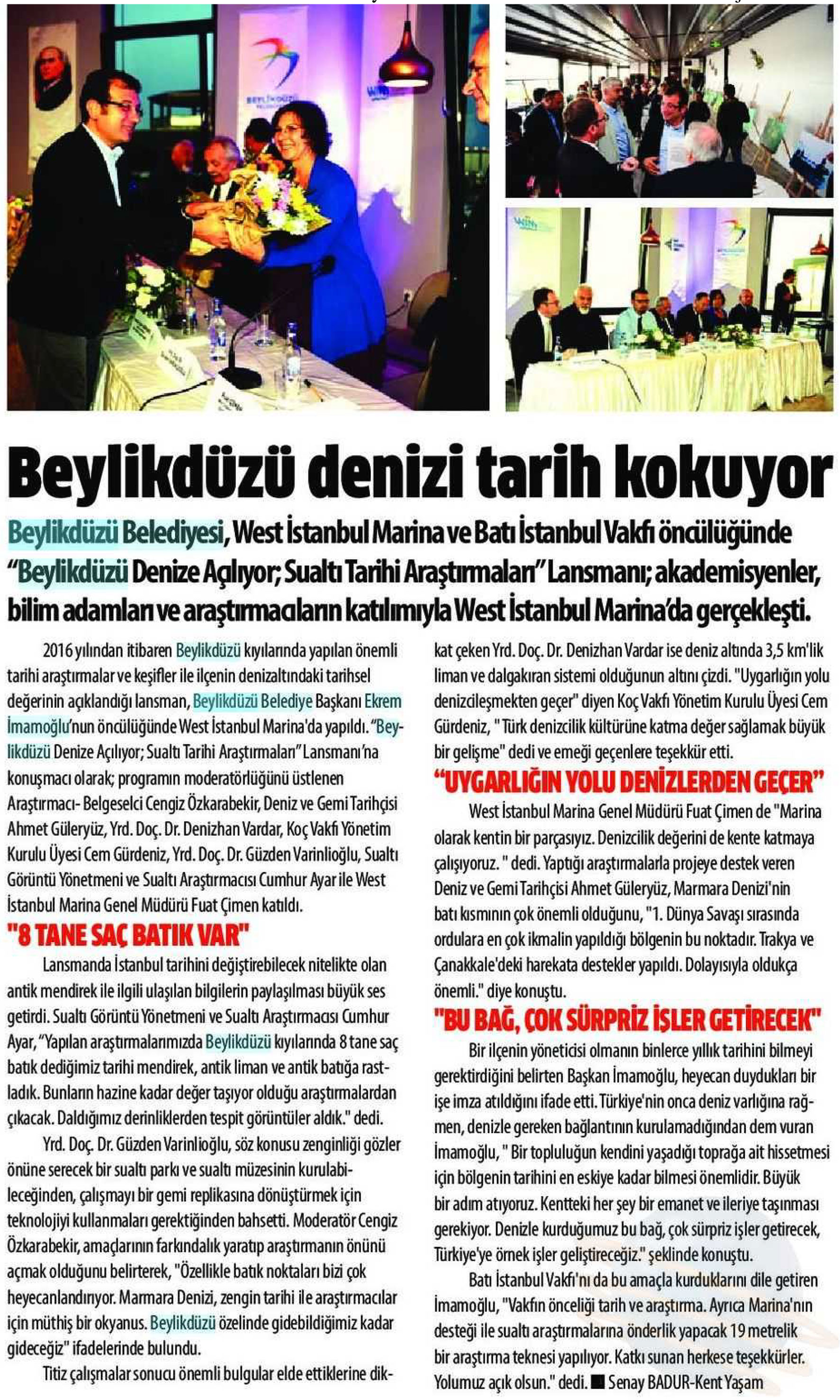 12 Ekim 2017 tarihli "KENT YAŞAM" gazetesi. "Beylikdüzü Belediyesi, West İstanbul Marina ve Batı İstanbul Vakfı öncülüğünde Beylikdüzü Denize Açılıyor; Sualtı Tarihi Araştırmaları" Lansmanı; akdemisyenler, bilimadamları ve araştırmacıların katılımıyla West İstanbul Marina'da gerçekleşti.