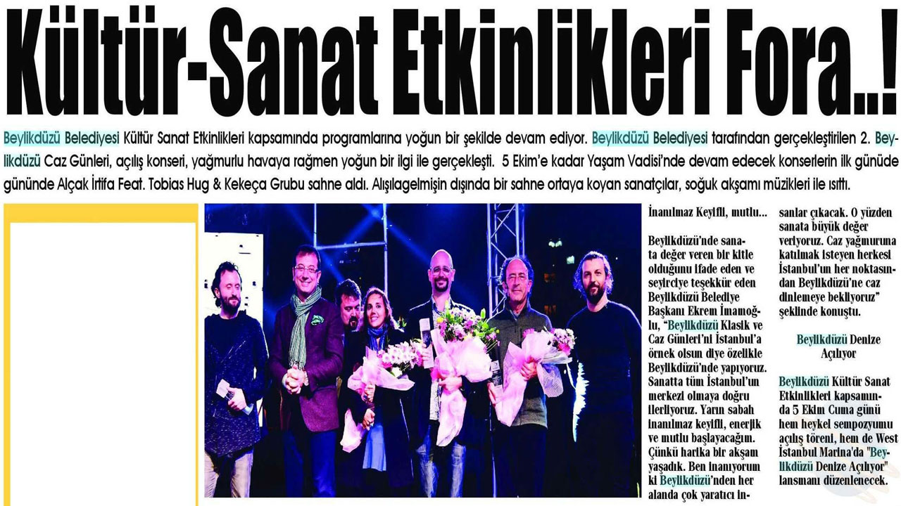 3 Ekim 2017 tarihli "Beylikdüzü" gazetesi. Beylikdüzü Belediyesi Kültür Sanat Etkinlikleri kapsamında programlarına yoğun bir şekilde devam ediyor. 2. Beylikdüzü Caz Günleri, açılış konseri, yağmurlu havaya rağmen yoğun bir ilgi ile gerçekleşti.