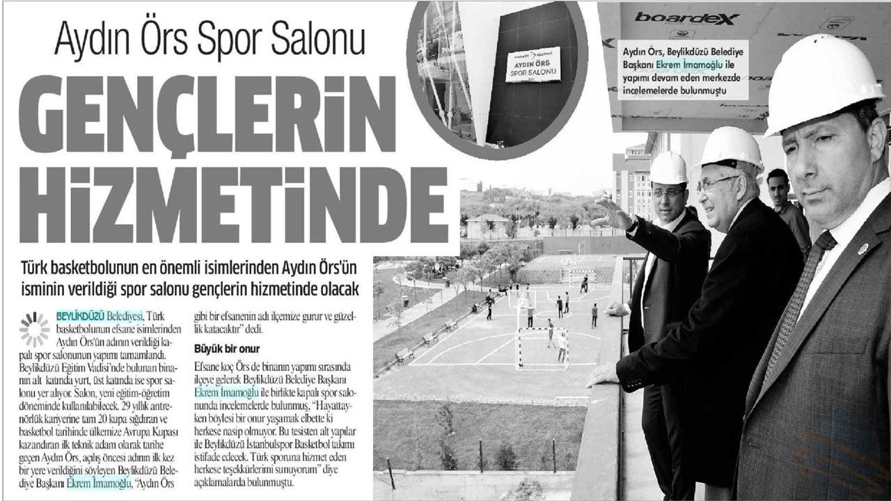 26 Eylül 2017 tarihli "GAZETEM İSTANBUL" gazetesi. Türk basketbolunun en önemli isimlerinden Aydın Örs'ün isminin verildiği spor salonu gençlerin hizmetinde olacak.