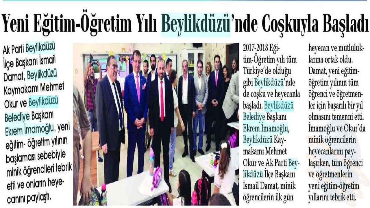 23 Eylül 2017 tarihli "Beylikdüzü" gazetesi. 2017-2018 Eğitim-Öğretim yılı tüm Türkiye'de olduğu gibi Beylikdüzü'nde çoşku ve heyecanla başladı. Beylikdüzü Belediye Başkanı Ekrem İmamoğlu, Beylikdüzü Kaymakamı Mehmet Okur ve Ak Parti Beylikdüzü İlçe Başkanı İsmail Damat öğrencileri tebrik etti ve onların heyecanını paylaştı.