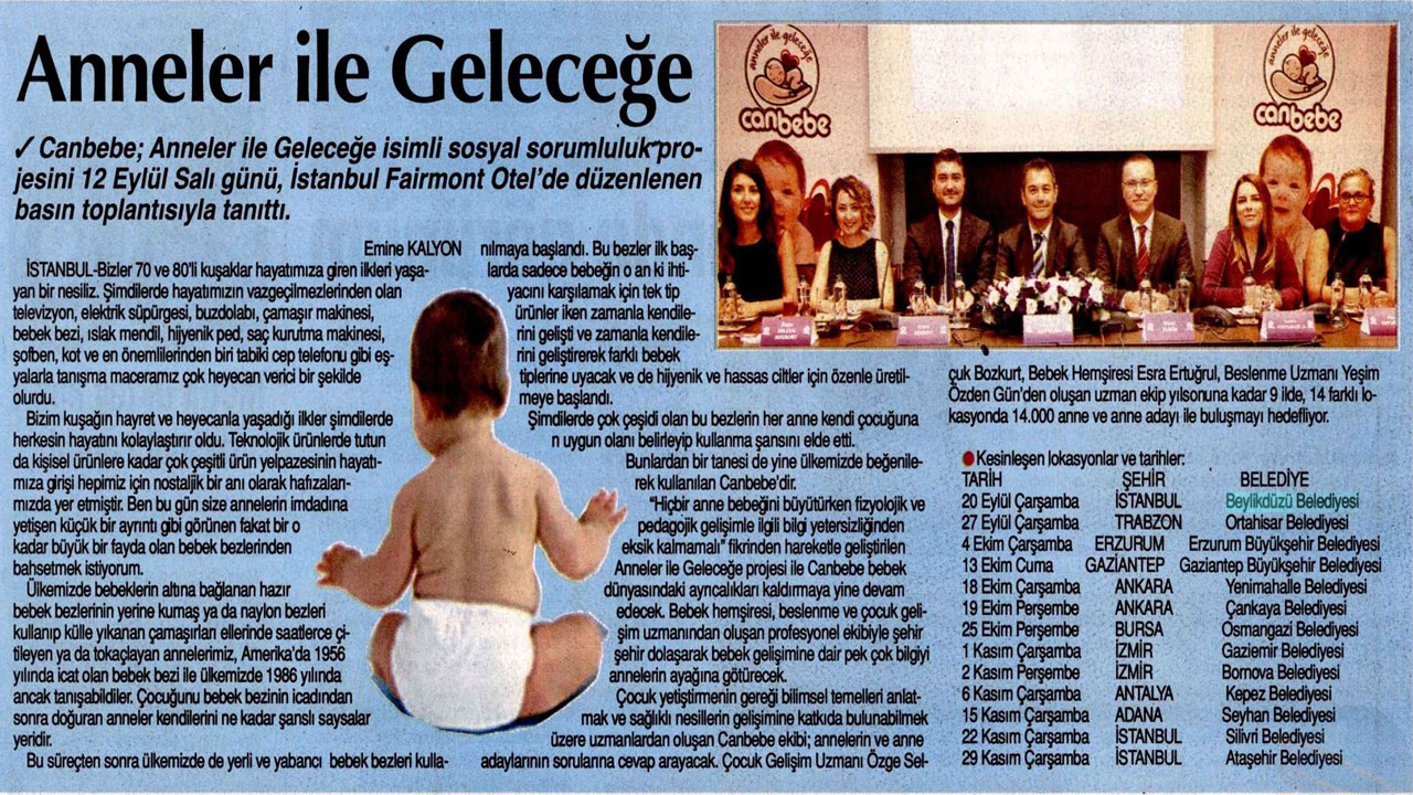 14 Eylül 2017 tarihli " SON AN" gazetesi. Canbebe; Anneler ile Geleceğe isimli sosyal sorumluluk projesini 12 Eylül Salı günü, İstanbul Fairmont Otel'de düzenlenen basın toplantısıyla tanıttı.