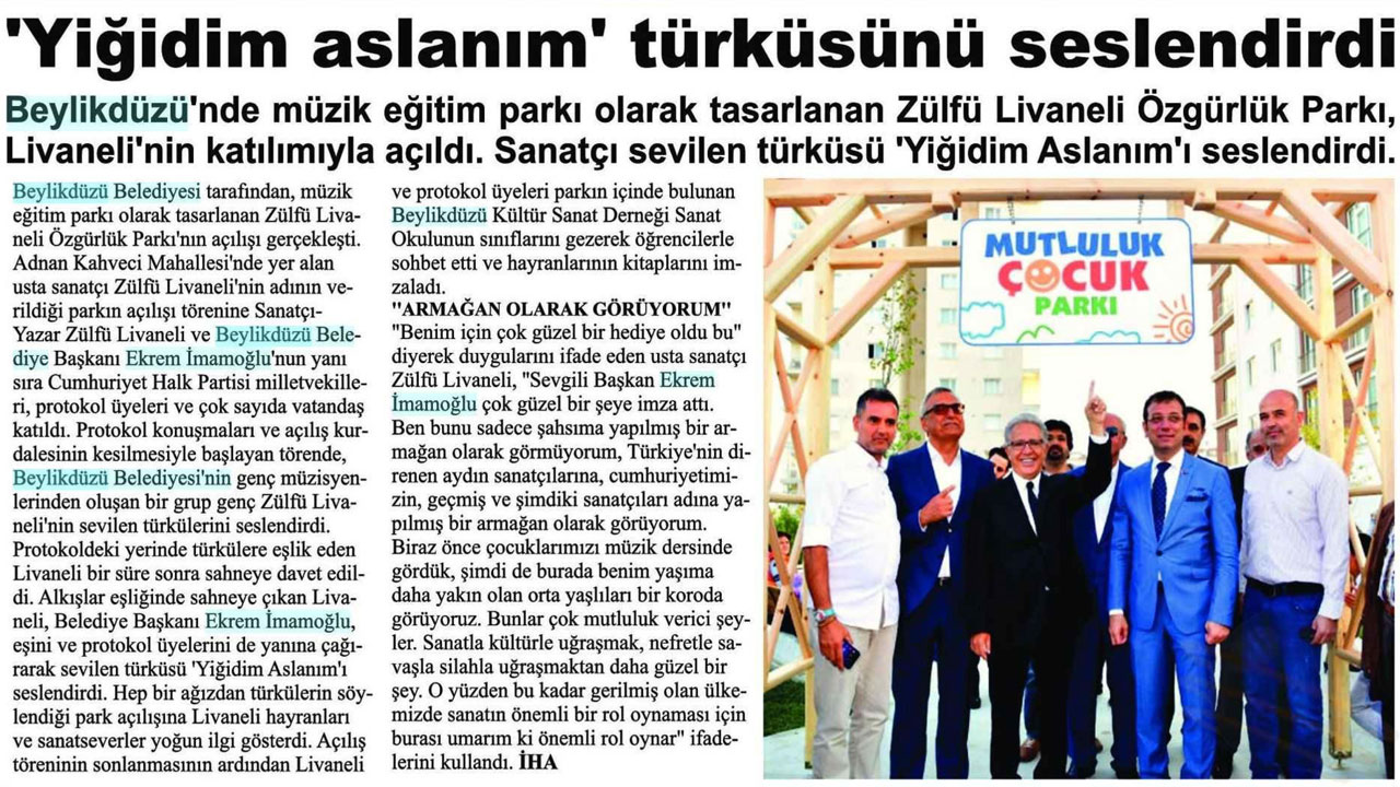 23 Ekim 2017 tarihli "ANTALYA GÜNDEM" gazetesi. İstanbul Beylikdüzü'nde müzik eğitim parkı olarak tasarlanan Zülfü Livaneli Özgürlük Parkı'nın açılışı gerçekleşti. Adnan Kahveci Mahallesi'nde yer alan usta sanatçı Zülfü Livaneli'nin adının verildiği parkın açılış töreni .sanatçı Zülfü Livaneli, Beylikdüzü Belediye Başkanı Ekrem İmamoğlu'nun yanı sıra Cumhuriyet Halk Partisi milletvekilleri, protokol üyeleri ve çok sayıda vatandaş katıldı.