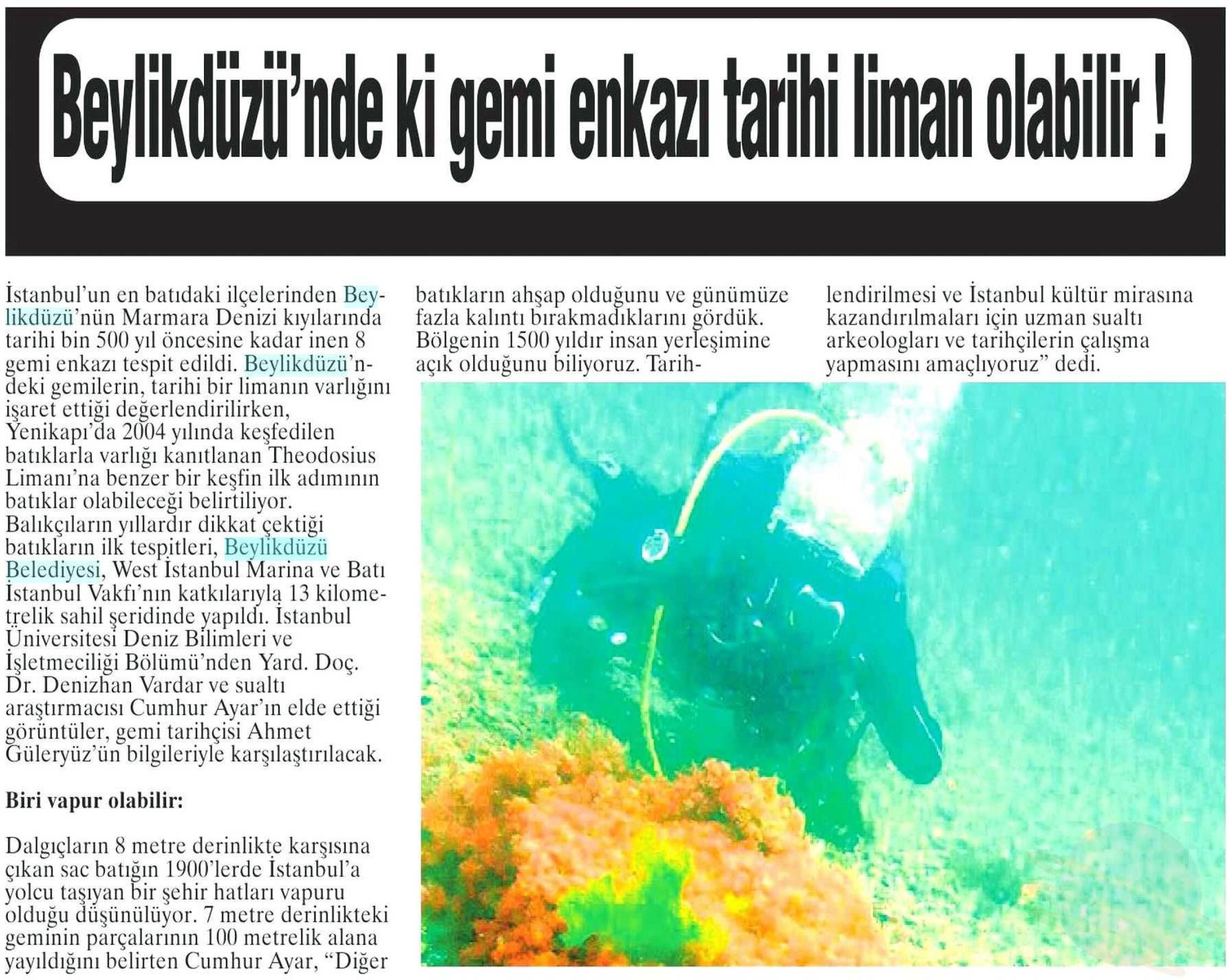 24 Ekim 2017 tarihli "NABIZ" gazetesi. İstanbul'un en batıdaki ilçelerinden Beylikdüzü'nün Marmara Denizi kıyılarında tarihi bin 500 yıl öncesine kadar inen 8 gemi enkazı tespit edildi. Beylikdüzü'ndeki gemilerin tarihi bir limanın varlığına işaret ettiği düşünülüyor. Balıkçıların yıllardır dikkat çektiği batıkların ilk tespitleri, Beylikdüzü Belediyesi, West İstanbul Marina ve Batı İstanbul Vakfı'nın katkılarıyla 13 kilometrelik sahil şeridinde yapıldı.