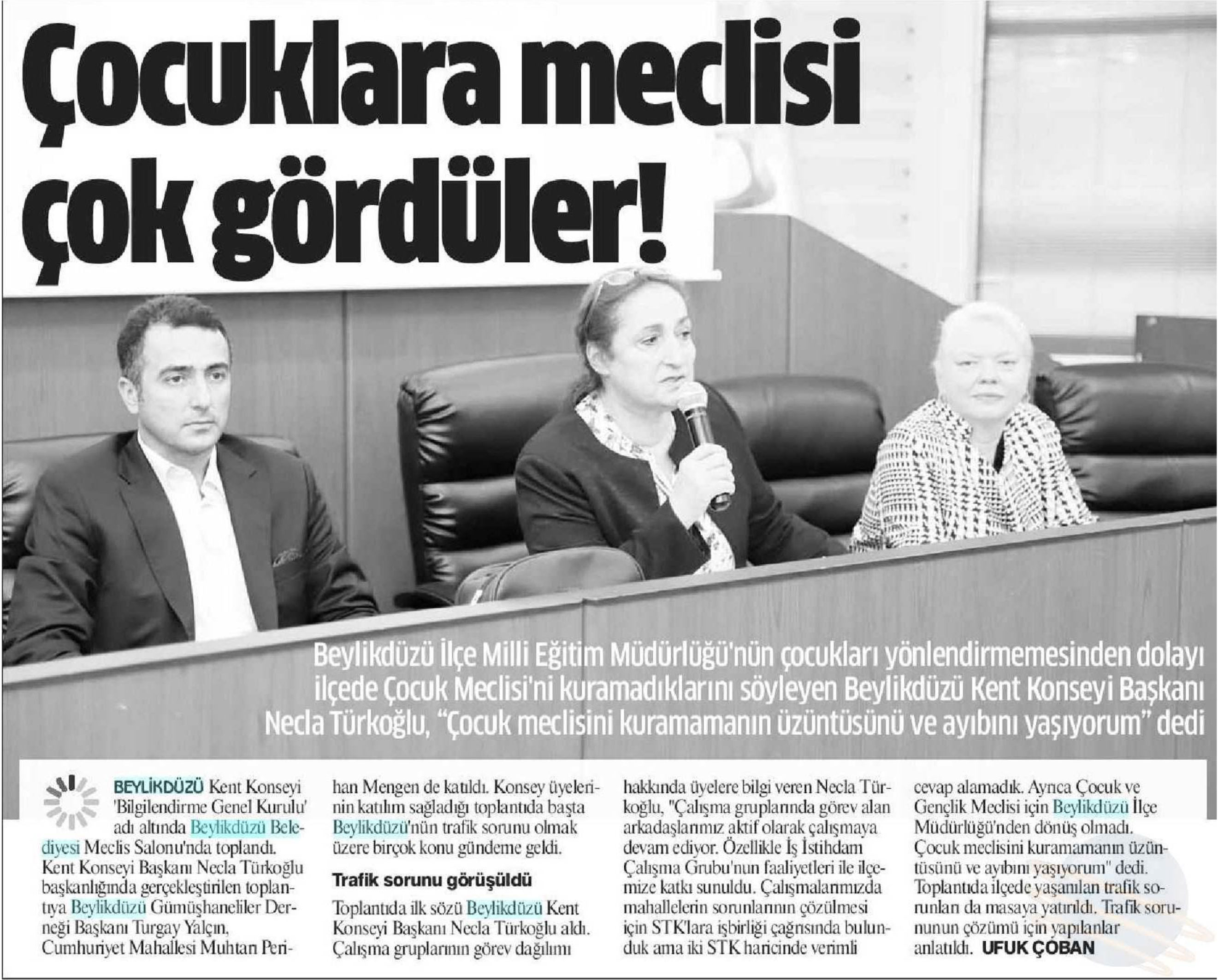 26 Ekim 2017 tarihli "GAZETEM İSTANBUL" gazetesi. Beylikdüzü İlçe Eğitim Müdürlüğü'nün çocukları yönlendirmemesinden dolayı ilçede Çocuk Meclisi'ni kuramadıklarını söyleyen Beylikdüzü Kent Konseyi Başkanı Necla Türkoğlu,"Çocuk meclisini kuramamanın üzüntüsünü ve ayıbını yaşıyorum" dedi.