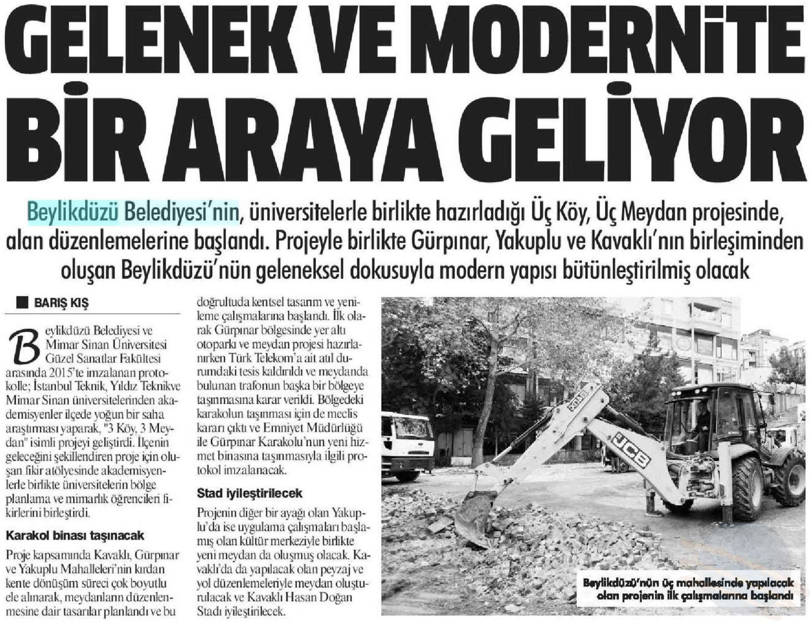 26 Ekim 2017 tarihli "GAZETEM İSTANBUL" gazetesi. Beylikdüzü Belediyesi'nin, üniversitelerle birlikte hazırladığı Üç Köy, Üç Meydan projesinde, alan düzenlemelerine başlandı. Projeyle birlikte Gürpınar, Yakuplu ve Kavaklı'nın birleşiminden oluşan Beylikdüzü'nün geleneksel dokusuyla modern yapısı bütünleştirilmiş olacak.