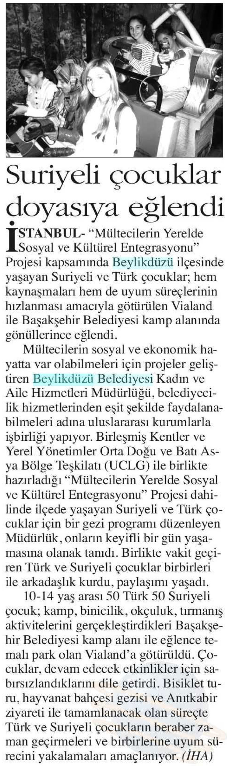 25 Ekim 2017 tarihli "ANAYURT" gazetesi. Beylikdüzü Belediyesi Kadın ve Aile Hizmetleri Müdürlüğü, "Mültecilerin Yerelde Sosyal ve Kültürel Entegrasyonu" Projesi dahilinde ilçede yaşayan Suriyeli ve Türk çocuklar için gezi programı düzenleyerek, onların keyifli bir gün yaşamasına olanak tanıdı.