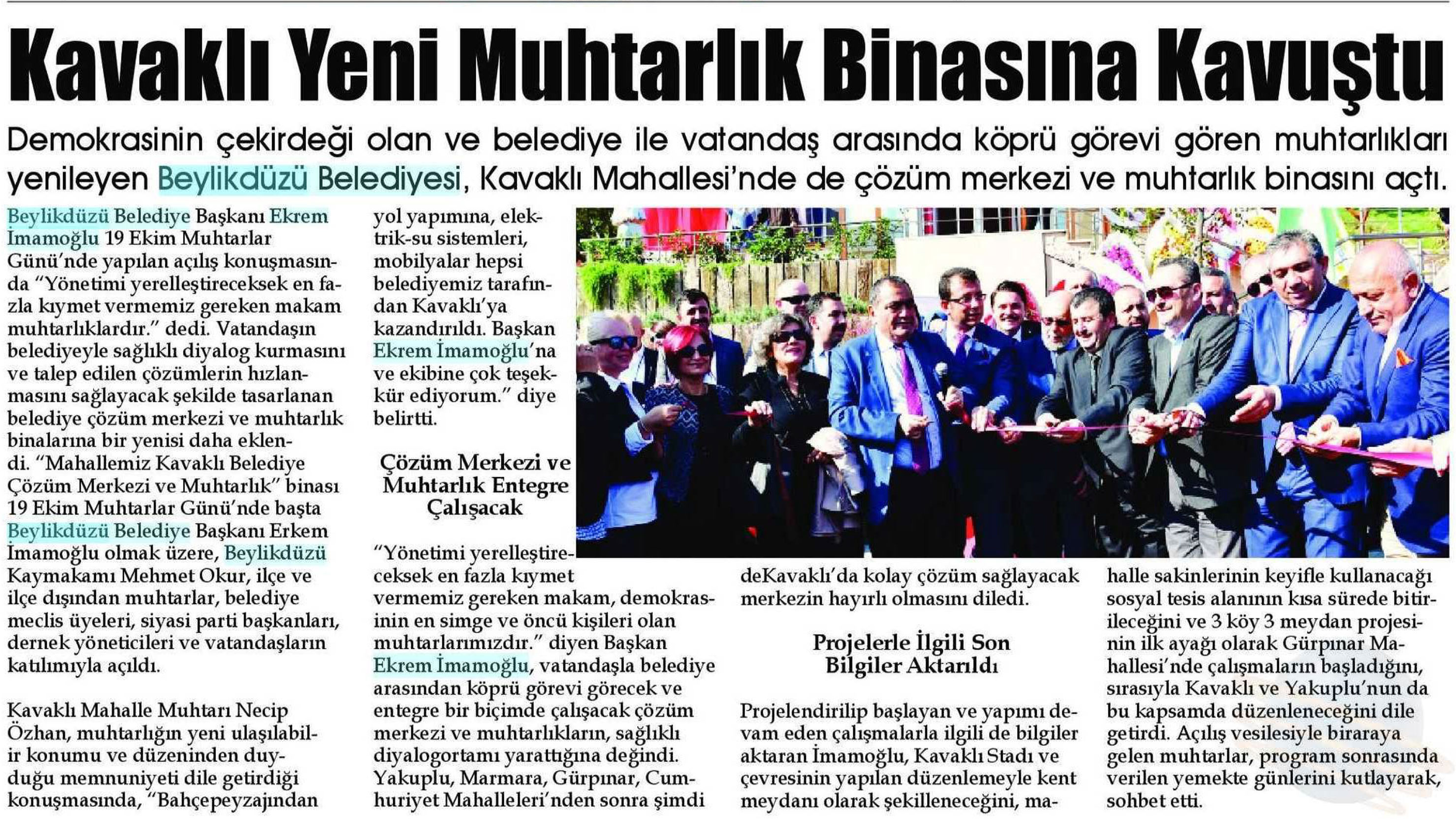 29 Ekim 2017 tarihli "BEYLİKDÜZÜ" gazetesi. Demokrasinin çekirdeği olan belediye ile vatandaş arasında köprü görevi gören muhtarlıkları yenileyen Beylikdüzü Belediyesi, Kavaklı Mahallesi'nde de çözüm merkezi ve muhtarlık binasını açtı.