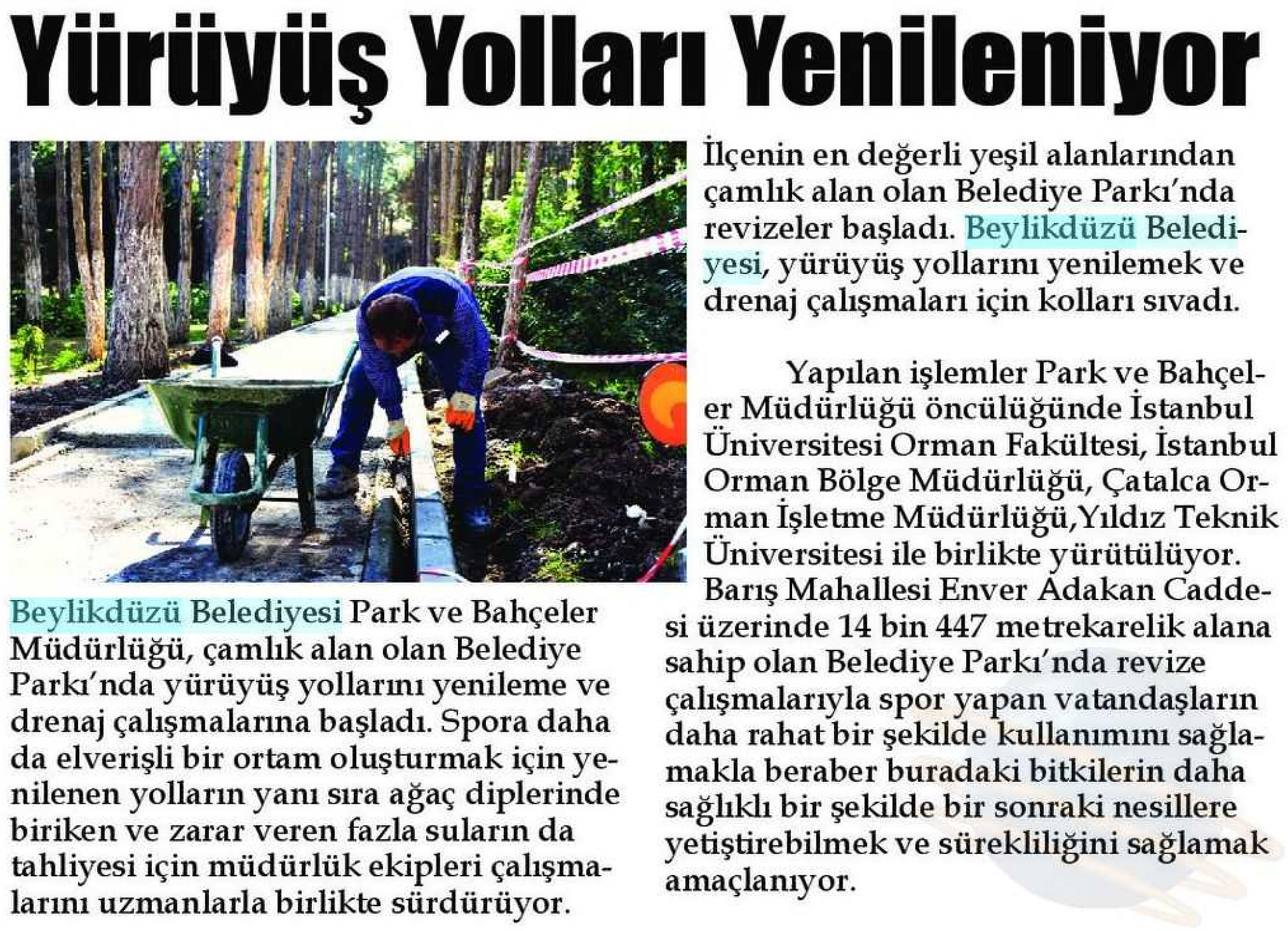 30 Ekim 2017 tarihli "BEYLİKDÜZÜ" gazetesi. Beylikdüzü Belediyesi Park ve Bahçeler Müdürlüğü, çamlık alan olan Belediye Parkı'nda yürüyüş yollarını yenileme ve drenaj çalışmalarına başladı.