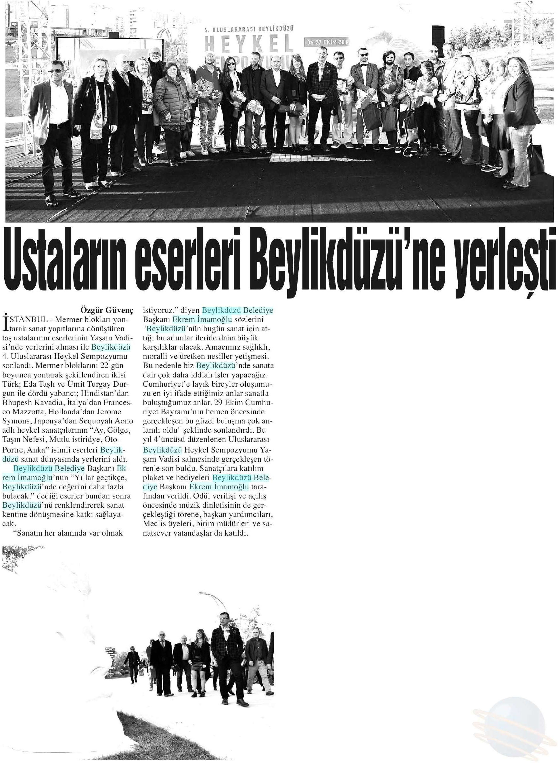 31 Ekim 2017 tarihli "ANA YURT" gazetesi. Beylikdüzü Belediyesi tarafından düzenlenen 4. Uluslararası Heykel Sempozyumu Yaşam Vadisi Sahnesinde gerçekleştirilen törenle son buldu. Sanatçılara katılım plaket ve hediyeleri Beylikdüzü Belediye Başkanı Ekrem İmamoğlu tarafından verildi.