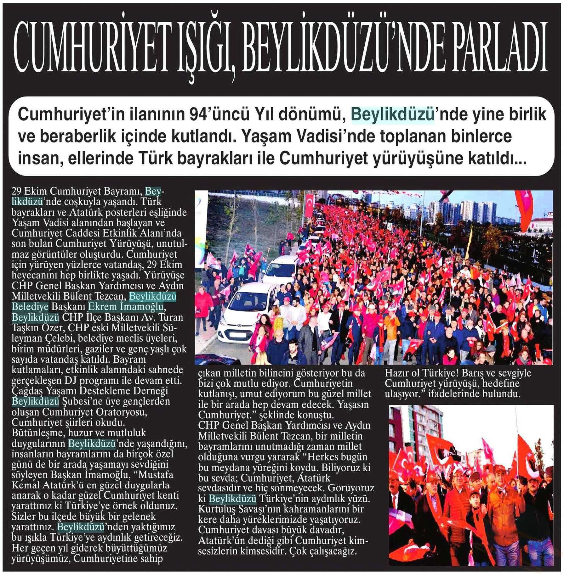 31 Ekim 2017 tarihli "NABIZ" gazetesi. Cumhuriyet'in 94'üncü Yıldönümü, Beylikdüzü'nde yine birlik ve beraberlik içinde kutlandı. Yaşam Vadisi'nde toplanan binlerce insan, ellerinde Türk bayrakları ile Cumhuriyet yürüyüşüne katıldı.