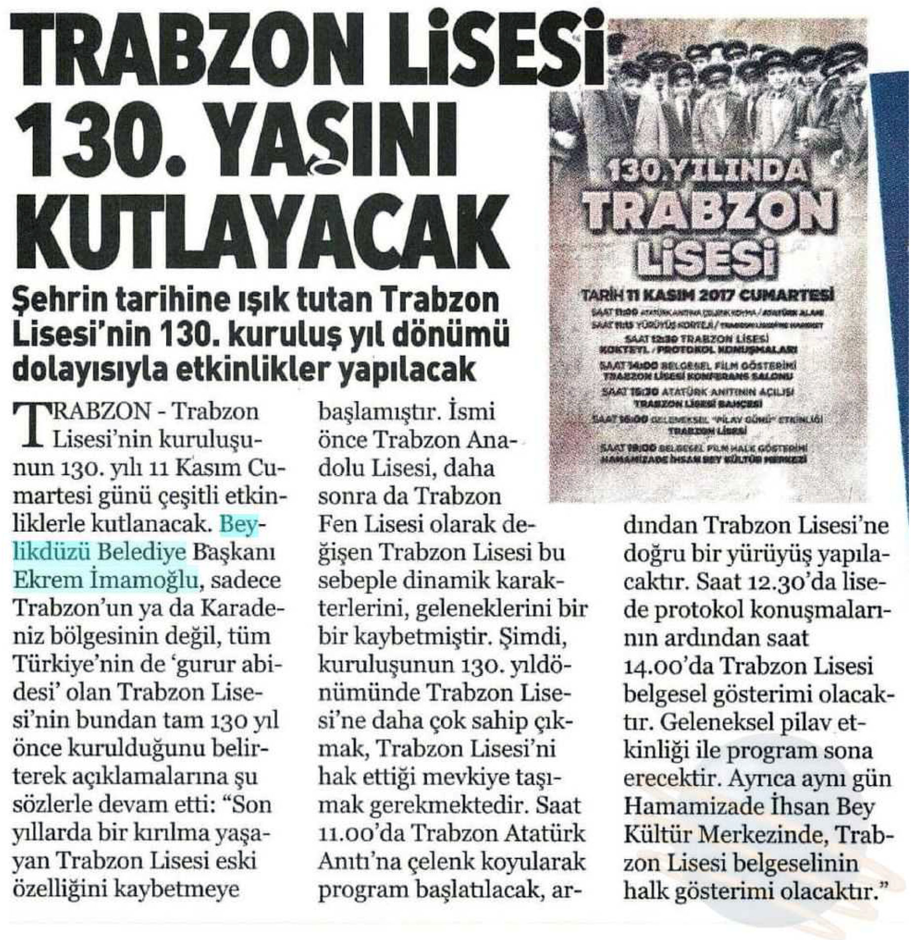 31.10.2017 tarihli "KARADENİZ" gazetesi. Şehrin tarihine ışık tutan Trabzon Lisesi'nin 130. kuruluş yılı 11 Kasım Cumartesi günü çeşitli etkinliklerle kutlanacak Saat 11.00'da Trabzon Atatürk Anıtı'na çelenk koyularak program başlatılıcak, ardından Trabzon Lisesi'ne doğru bir yürüyüş yapılacaktır. Trabzon Lisesi'ndeki asırlık manaolya ağacının önünde Atatürk anıtının açılışı gerçekleştirildikten sonra, saat 14.00'da Trabzon Lisesi belgesel gösterimi izleyicileri ile buluşacak.