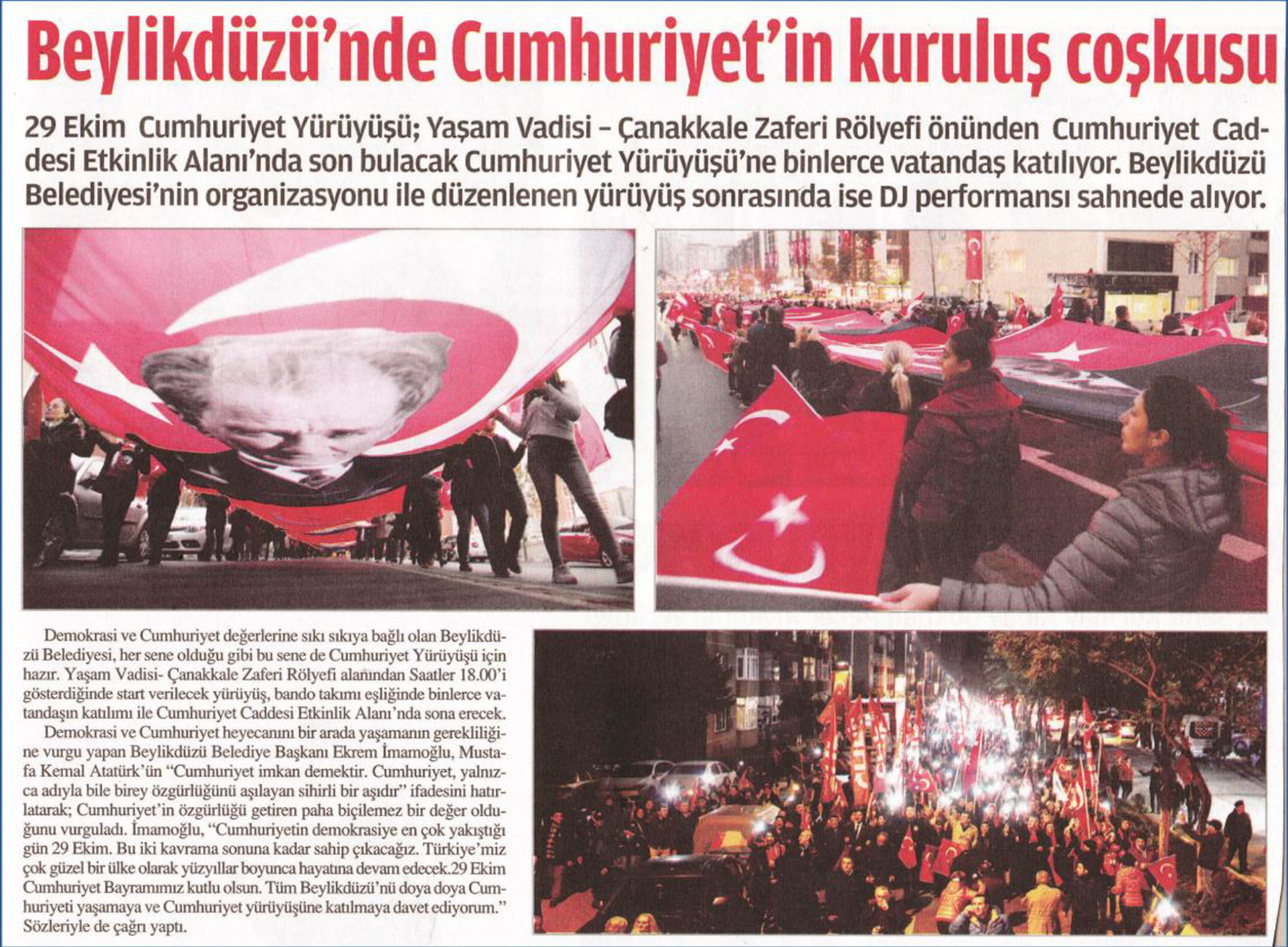 2 Kasım 2017 tarihli "BİZİM YAŞAM" gazetesi. 29 Ekim Cumhuriyet Yürüyüşü; Yaşam Vadisi-Çanakkale Zaferi Rölyefi önünden Cumhuriyet Caddesi Etkinlik Alanı'nda son bulacak Cumhuriyet Yürüyüşü'ne binlerce vatandaş katılıyor.Beylikdüzü Belediyesi'nin organizasyonu ile düzenlenen yürüyüş sonrasında ise DJ performansı sahnede alıyor.