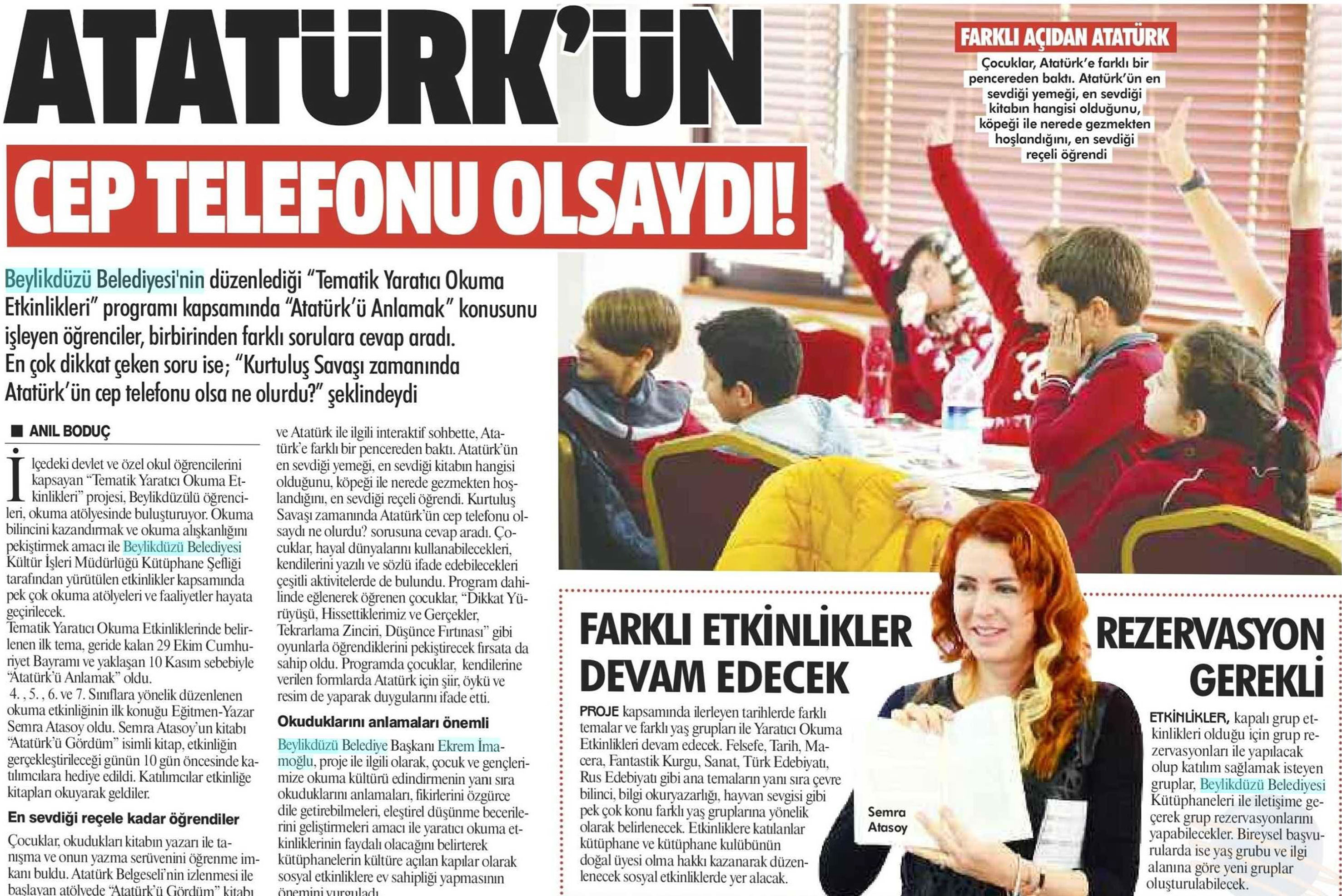 3 Kasım 2017 tarihli "GAZETEM İSTANBUL" gazetesi. Beylikdüzü Belediyesi'nin düzenlediği "Tematik Yaratıcı Okuma Etkinlikleri" programı kapsamında "Atatürk'ü Anlamak" konusunu işleyen öğrenciler, birbirinden farklı sorulara cevap aradı. En çok dikkat çeken soru ise; "Kurtuluş Savaşı zamanında Atatürk'ün cep telefonu olsa ne olurdu?" şeklindeydi.