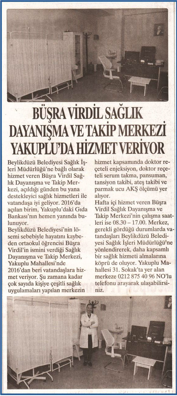 6 Kasım 2017 tarihli "BÜYÜKÇEKMECE" gazetesi. Beylikdüzü Belediyesi'nin lösemi sebebiyle hayatını kaybeden ortaokul öğrencisi Büşra Virdil'in ismini verdiği Sağlık Dayanışma ve Takip Merkezi,Yakuplu Mahallesi'nde vatandaşlara hizmet veriyor.