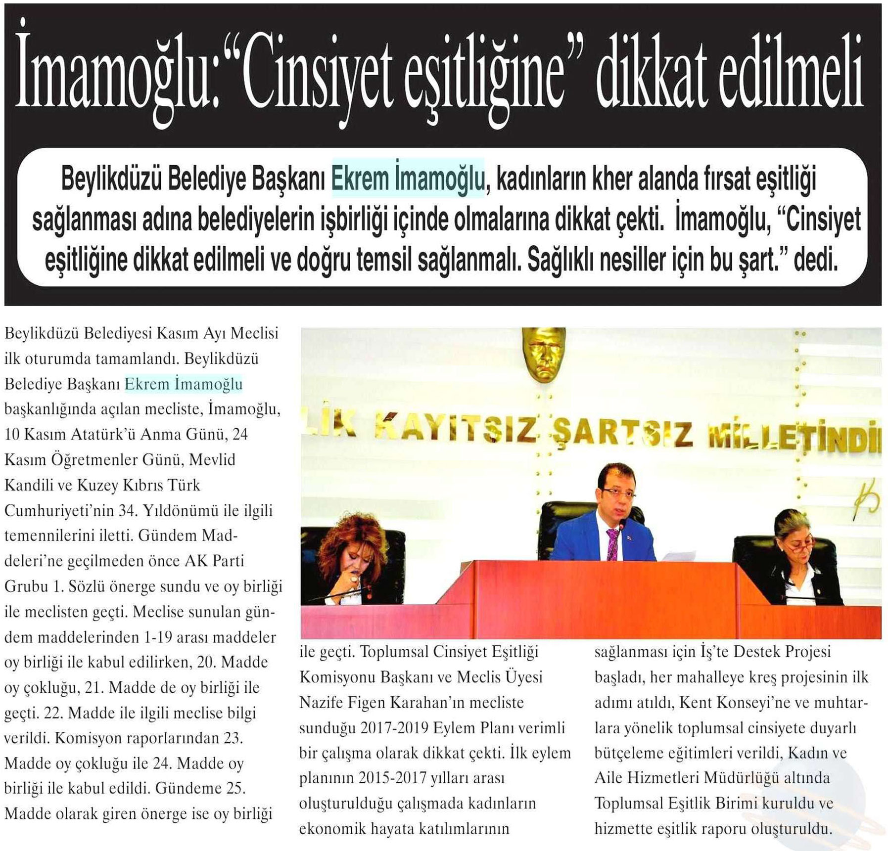 7 Kasım 2017 tarihli "NABIZ" gazetesi. Beylikdüzü Belediye Başkanı Ekem İmamoğlu, kadınların her alanda fırsat eşitliği sağlanması adına belediyelerin işbirliği içinde olmalarına dikkat çekti. İmamoğlu, "Cinsiyet eşitliğine dikkat edilmeli ve doğru temsil sağlanmalı. Sağlıklı nesiller için bu şart." dedi.
