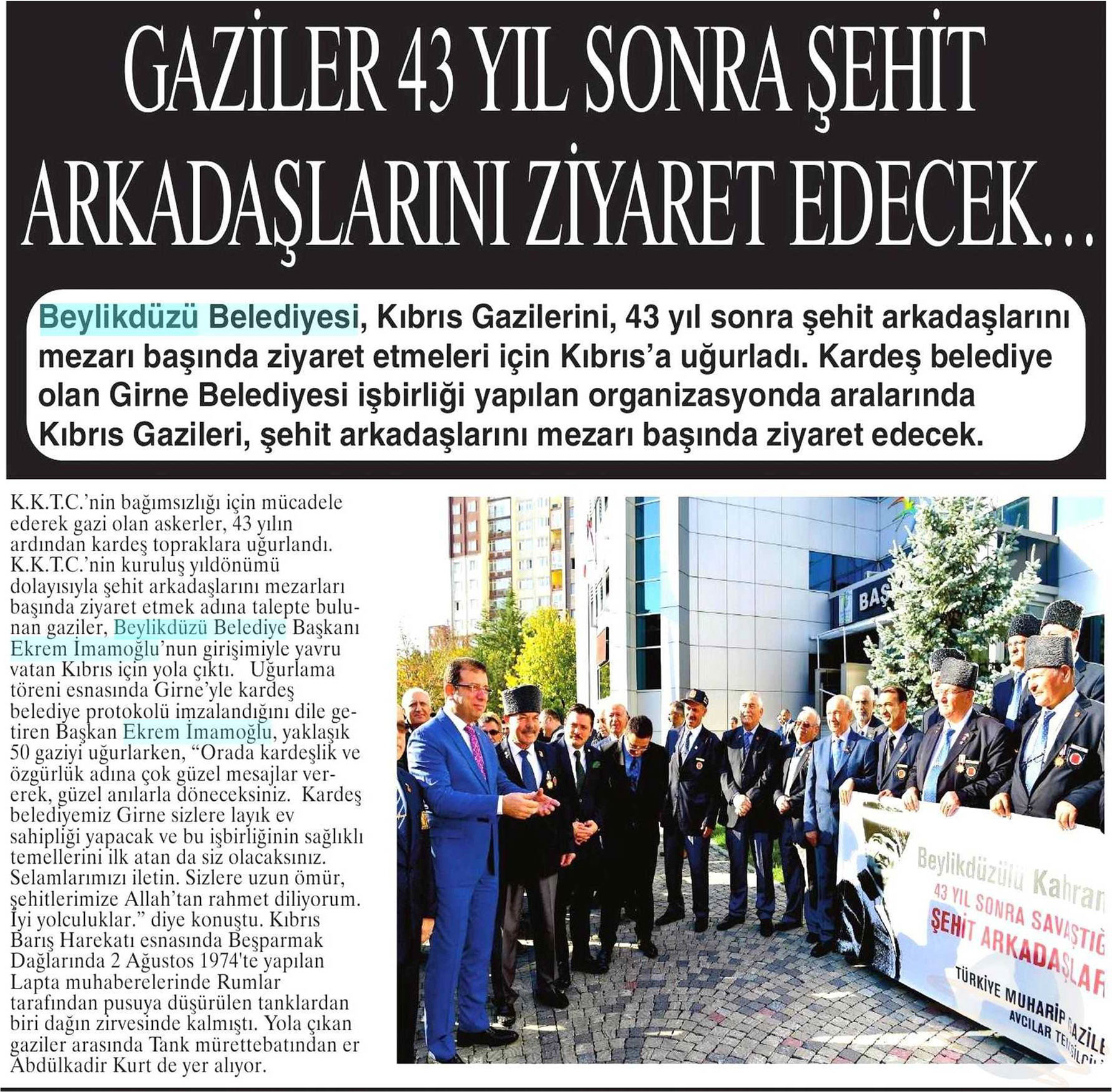 7 Kasım 2017 tarihli "NABIZ" gazetesi. Beylikdüzü Belediyesi, Kıbrıs Gazilerini, 43 yıl sonra şehit arkadaşlarını mezarı başında ziyaret etmeleri için Kıbrıs'a uğurladı.Kardeş Belediye olan Girne Belediyesi işbirliği yapılan organizasyonda aralarında Kıbrıs Gazileri, şehit arkadaşlarını mezarı başında ziyaret edecek.