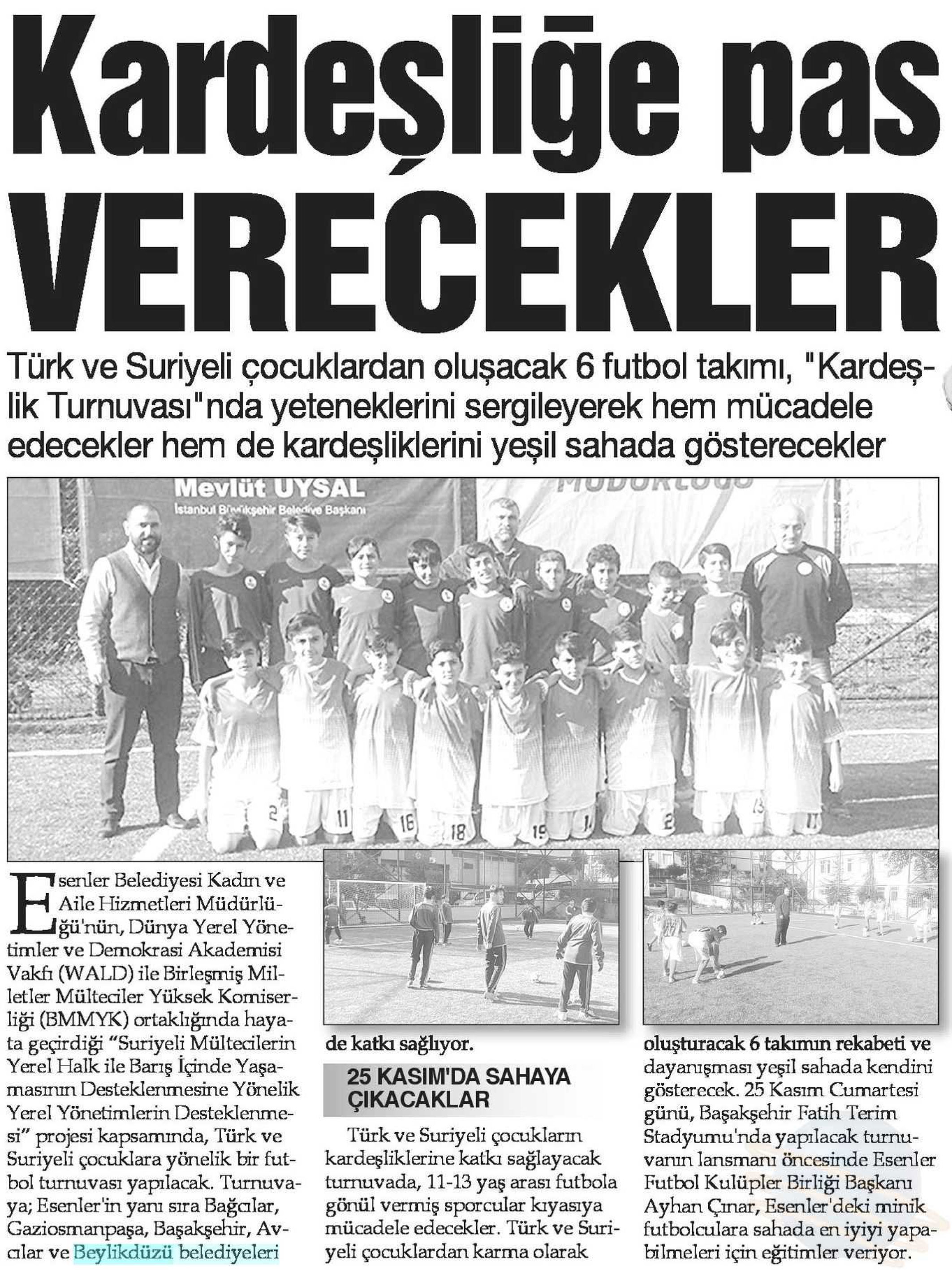 8 Kasım 2017 tarihli "İSTANBUL" gazetesi. Esenler Belediyesi Kadın ve Aile Hizmetleri Müdürlüğü'nün, Dünya Yerel Yönetimler ve Demokrasi Akademisi Vakfı (WALD) ile Birleşmiş Milletler Mülteciler Yüksek Komiserliği (BMMYK) orataklığında hayata geçirdiği "Suriyeli Mültecilerin Yerel Halk ile Barış İçinde Yaşamasının Desteklenmesine Yönelik Yerel Yönetimlerin Desteklenmesi" projesi kapsamında, Türk ve Suriyeli çocuklara yönelik bir futbol turnuvası yapılacak. Turnuvaya; Esenler Belediyesi, Bağcılar, Gaziosmanpaşa, Başakşehir, Avcılar ve Beylikdüzü belediyeleri katkı sağlıyor.