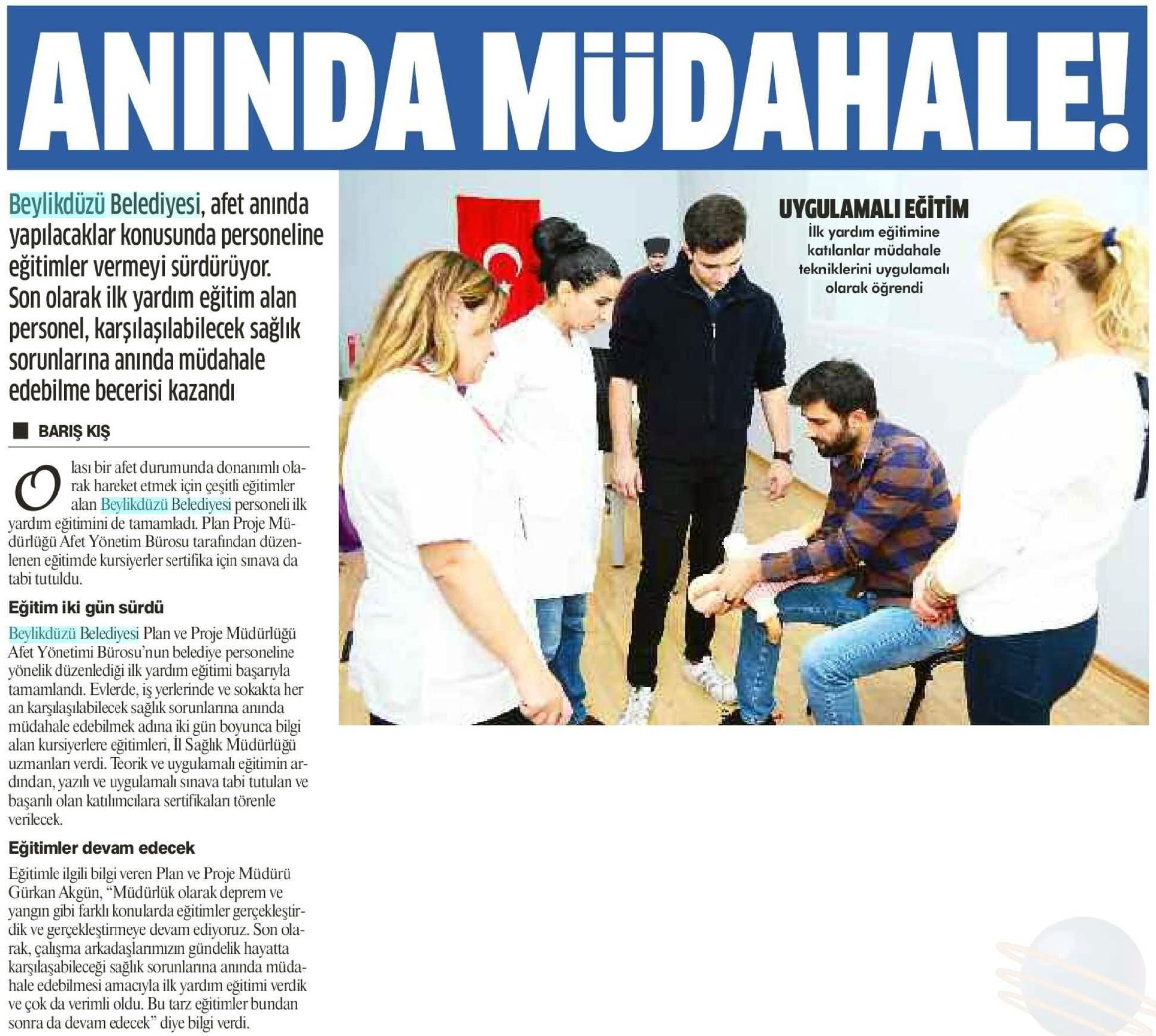 8 Kasım 2017 tarihli "GAZETEM İSTANBUL" gazetesi. Beylikdüzü Belediyesi, afet anında yapılacaklar konusunda personeline eğitimler vermeyi sürdürüyor. Son olarak ilk yardım eğitim alan personel, karşılaşılabilecek sağlık sorunlarına anında müdahale edebilme becerisi kazandı.