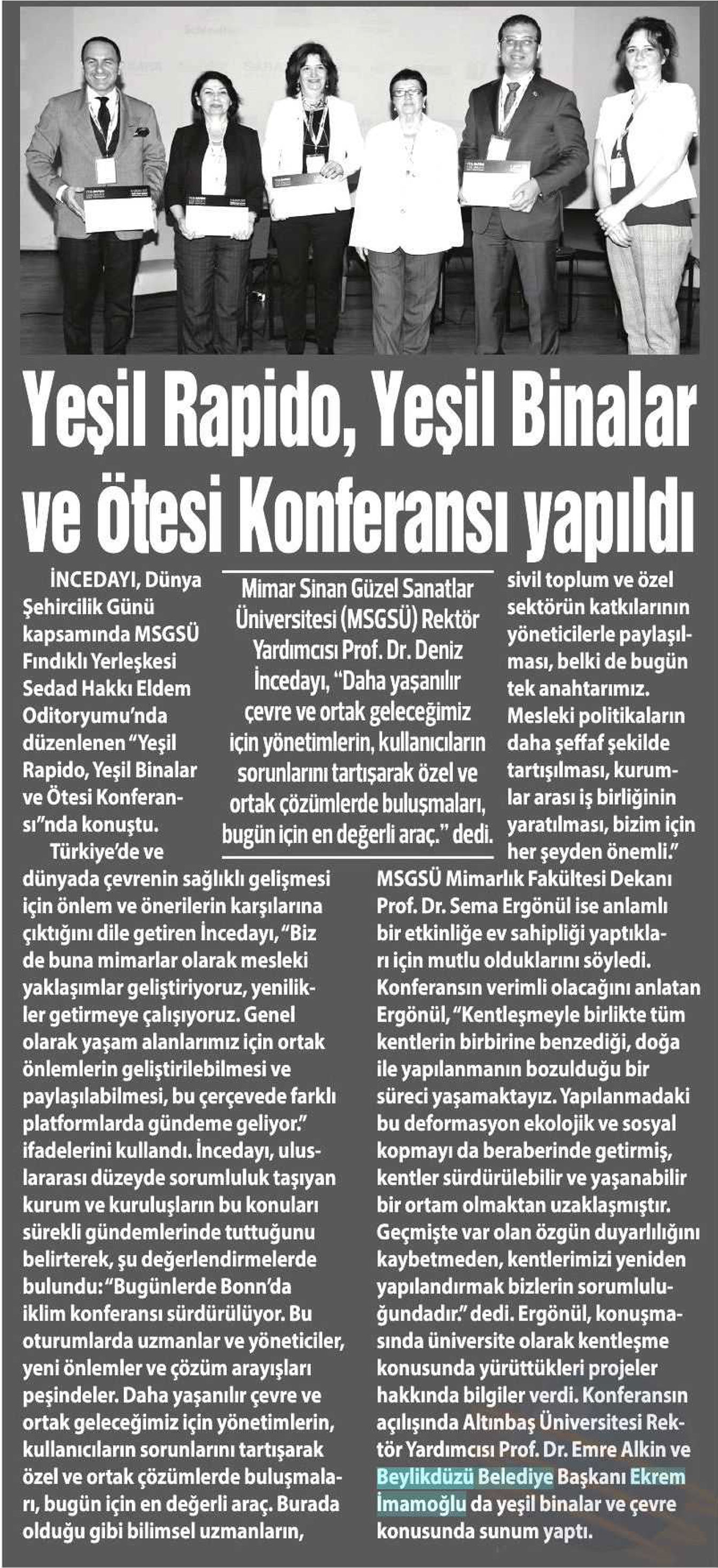 9 Kasım 2017 tarihi "YENİ BİRLİK" gazetesi. Mimar Sinan Güzel Sanatlar Üniversitesi Rektör Yardımcısı Prof.Dr.Deniz İncedayı, "Daha yaşanılır çevre ve ortak geleceğimiz için yönetimlerin, kullanıcıların sorunlarını tartışarak özel ve ortak çözümlerde buluşmaları, bugün için en değerli araç." dedi. Beylikdüzü Belediye Başkanı Ekrem İmamoğlu da yeşil binalar ve çevre konusunda sunum yaptı.