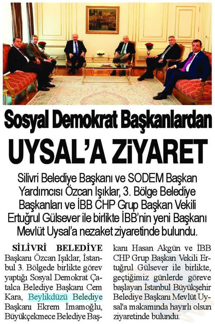 13 Kasım 2017 tarihli "HÜR HABER" gazetesi. Silivri Belediye Başkanı ve SODEM Başkan Yardımcısı Özcan Işıklar, 3. Bölge Belediye Başkanları ve İBB CHP Grup Başkan Vekili Ertuğrul Gülsever ile birlikte İBB'nin yeni Başkanı Mevlüt Uysal'a nezaket ziyaretinde bulundu.