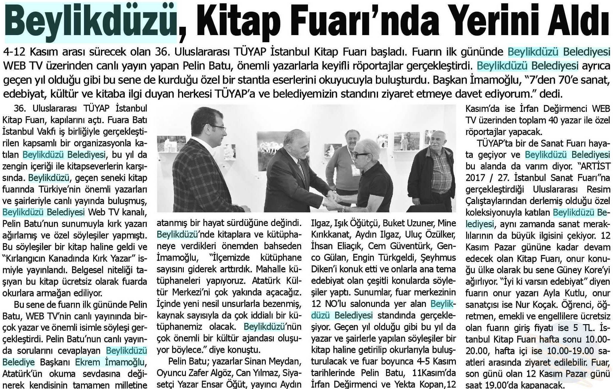13 Kasım 2017 tarihli "İÇ SES" gazetesi. 4-12 Kasım arası sürecek olan 36. Uluslararası TÜYAP İstanbul Kitap Fuarı başladı. Fuarın ilk gününde Beylikdüzü Belediyesi WEB TV canlı yayın yapan Pelin Batu, önemli yazarlarla keyifli röportajlar gerçekleştirdi. Beylikdüzü Belediyesi ayrıca geçen yıl olduğu gibi bu sene de kurduğu özel bir stantla eserlerini okuyucuya buluşturdu. Başkan İmamoğlu "7den 70'e sanat, edebiyat, kültür, ve kitaba ilgi duyan herkesi TÜYAP'a ve belediyemizin standını ziyaret etmeye davet ediyorum." dedi.