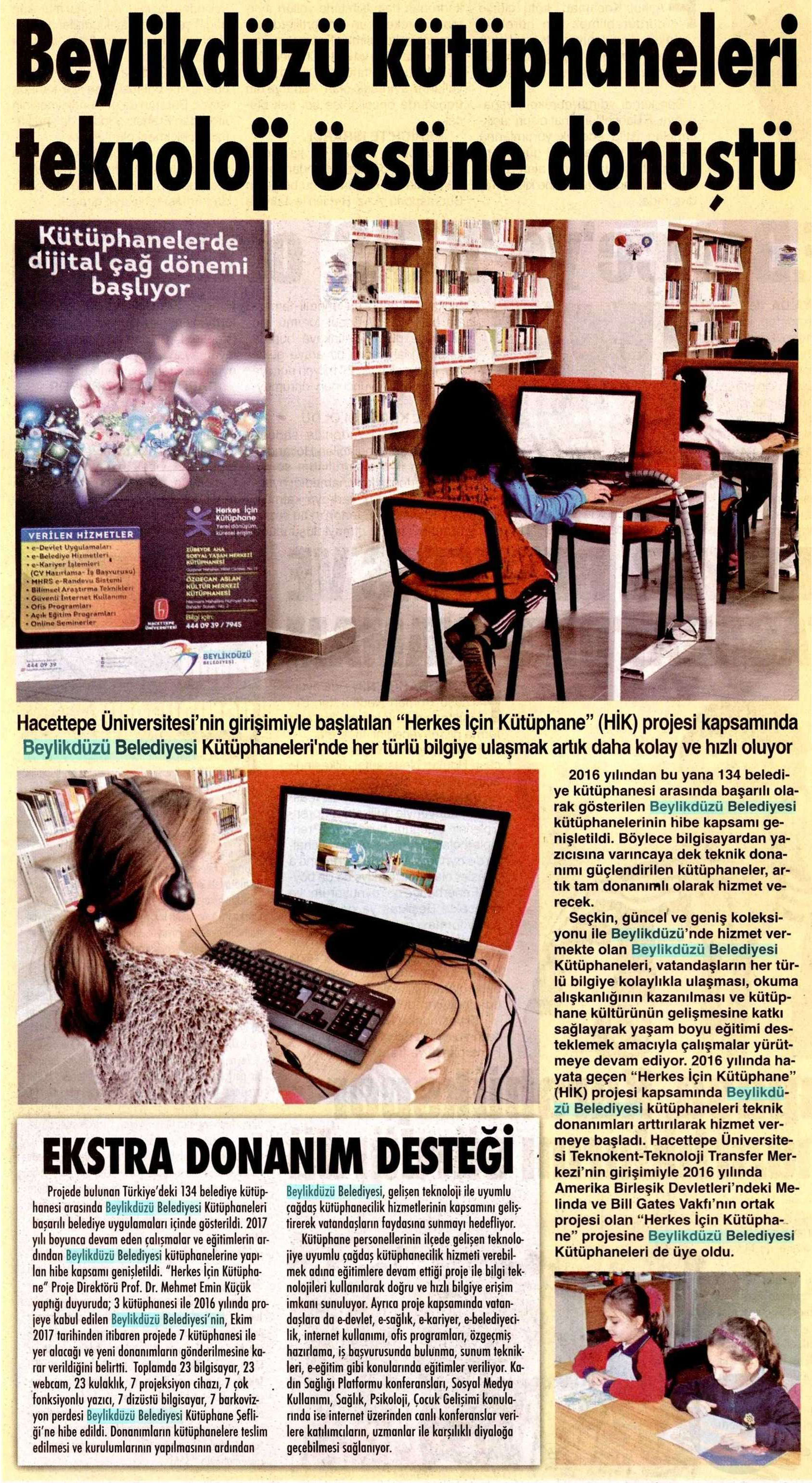 13 Kasım 2017 tarihli "YENİ GÜN" gazetesi. Hacettepe Üniversitesi'nin girişimiyle başlatılan "Herkes İçin Kütüphane" (HİK) projesi kapsamında Beylikdüzü Belediyesi Kütüphaneleri'nde her türlü bilgiye ulaşmak artık daha kolay ve hızlı oluyor.