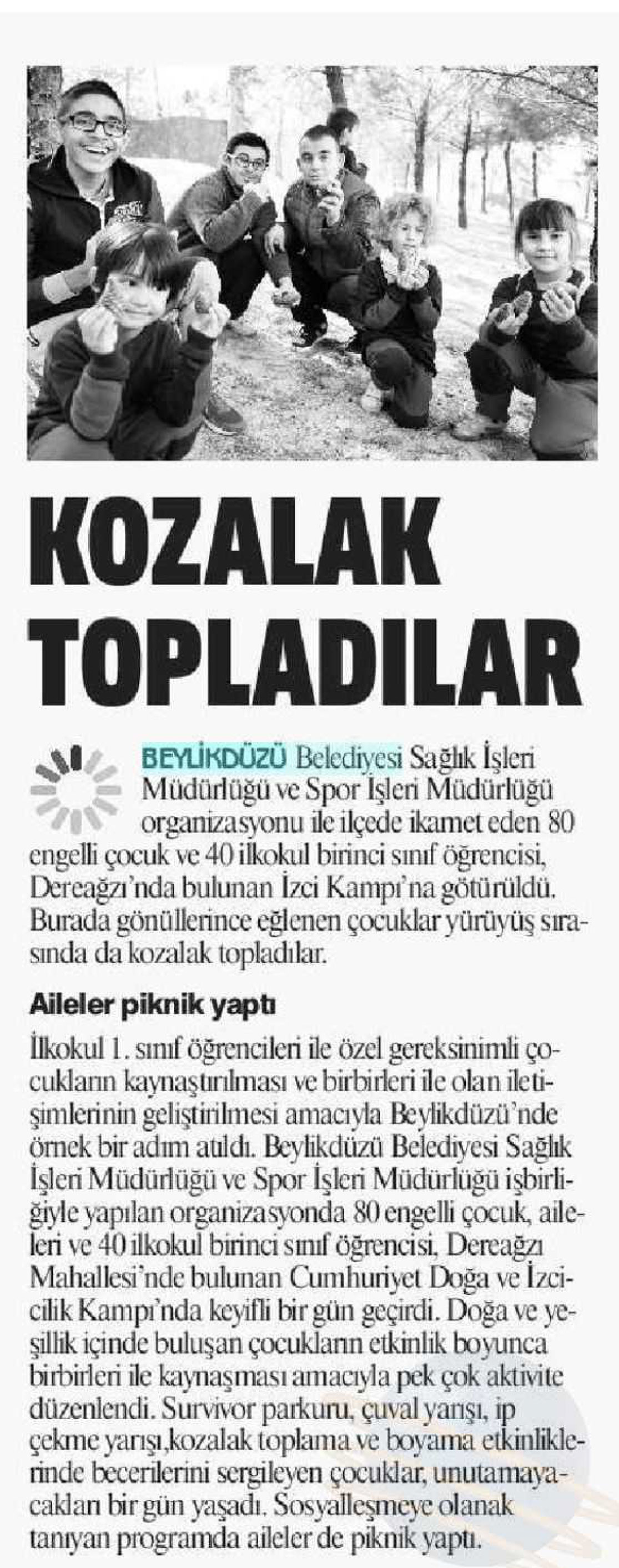 14 Kasım 2017 tarihli "GAZETEM İSTANBUL" gazetesi. Beylikdüzü Belediyesi Sağlık İşleri Müdürlüğü organizasyonu ile ilçede ikamet eden 80 engelli çocuk ve 40 ilkokul birinci sınıf öğrencisi, Dereağzı'nda bulunan İzci Kampı'na götürüldü.