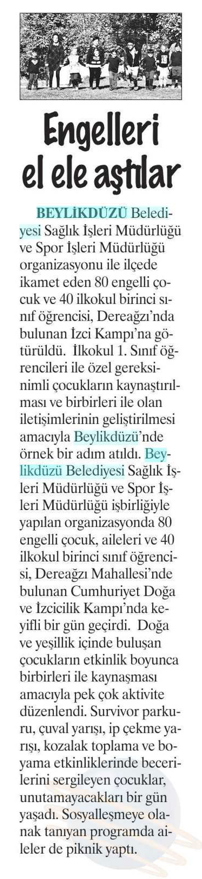 16 Kasım 2017 tarihli "DOKUZ SÜTUN" gazetesi. Beylikdüzü Belediyesi Sağlık İşleri Müdürlüğü ve Spor İşleri Müdürlüğü organizasyonu ile ilçede ikamet eden 80 engelli çocuk ve 40 ilkokul birinci sınıf öğrencisi, Dereağzı'nda bulunan İzci Kapı'na götürüldü.