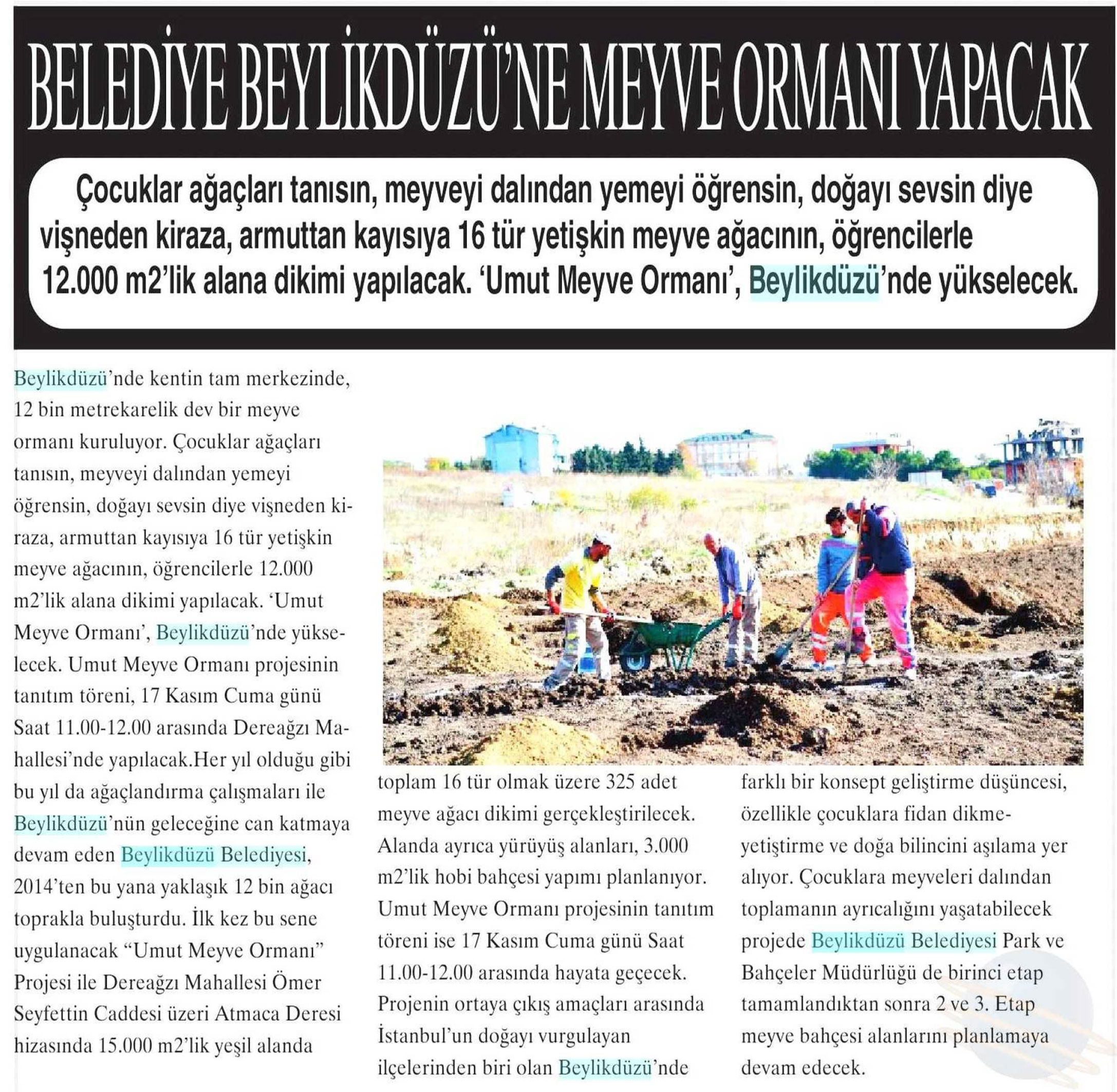 16 Kasım 2017 tarihli "NABIZ" gazetesi. Çocuklar ağaçları tanısın, meyveyi dalından yemeyi öğrensin, doğayı sevsin diye vişneden kiraza, armuttan kayısıya 16 tür yetişkin meyve ağacının ,öğrencilerle 12.000 m2'lik alana dikimi yapılacak. "Umut Meyve Ormanı" , Beylikdüzü'nde yükselecek.