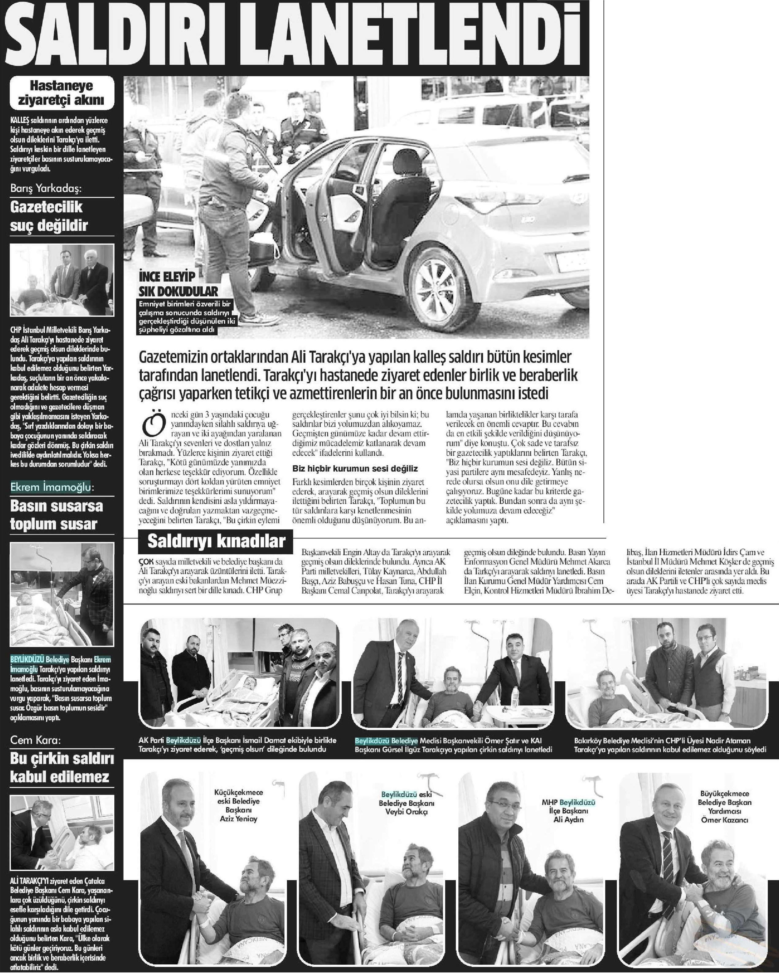 22 Kasım 2017 tarihli " GAZETEM İSTANBUL" gazetesi. Gazetem İstanbul gazetesinin ortaklarından Ali Tarakçı'ya yapılan saldırı bütün kesimler tarafından lanetlendi. Tarakçı'yı hastanede ziyaret edenler birlik ve beraberlik çağrısı yaparken tetikçi ve azmettirenlerin bir an önce bulunmasını istedi.