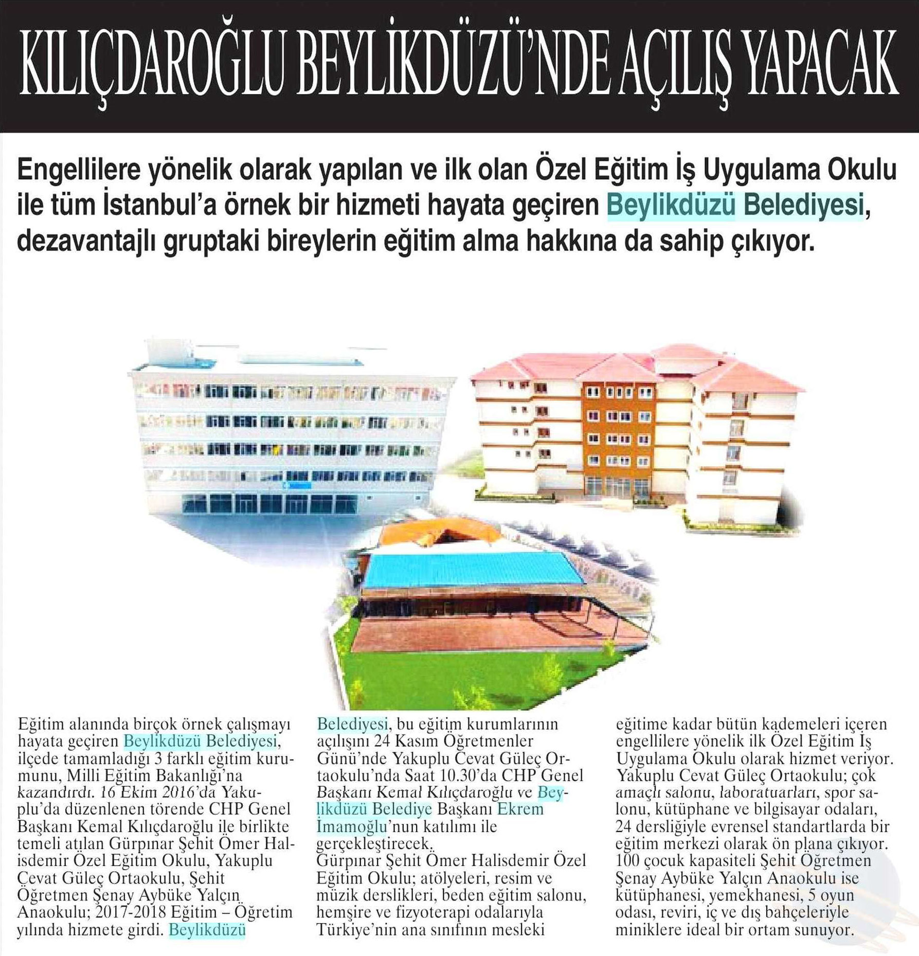 22 Kasım 2017 tarihli "NABIZ" gazetesi. Engellilere yönelik yapılan ilk olan Özel Eğitim İş Uygulama Okulu ile tüm İstanbul'a örnek bir hizmeti hayata geçiren Beylikdüzü Belediyesi, dezavantajlı gruptaki bireylerin eğitim alma hakkına da sahip çıkıyor.