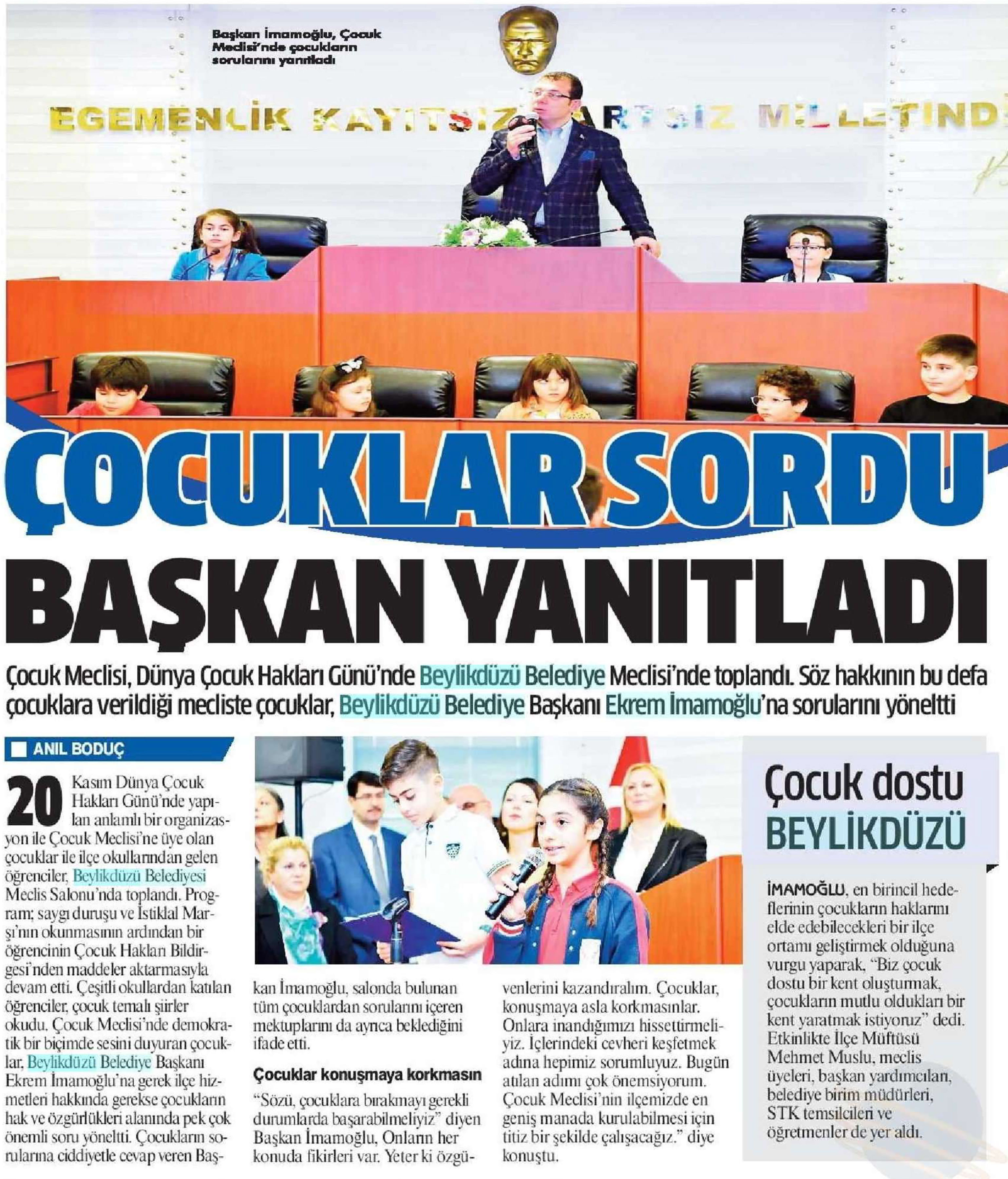 21 Kasım 2017 tarihli "GAZETEM İSTANBUL" gazetesi. Çocuk Meclisi, Dünya Çocuk Hakları Günü'nde Beylikdüzü Belediyesi Meclisi'nde toplandı. Söz hakkının bu defa çocuklara verildiği mecliste çocuklar, Beylikdüzü Belediye Başkanı Ekrem İmamoğlu'na sorularını yöneltti.
