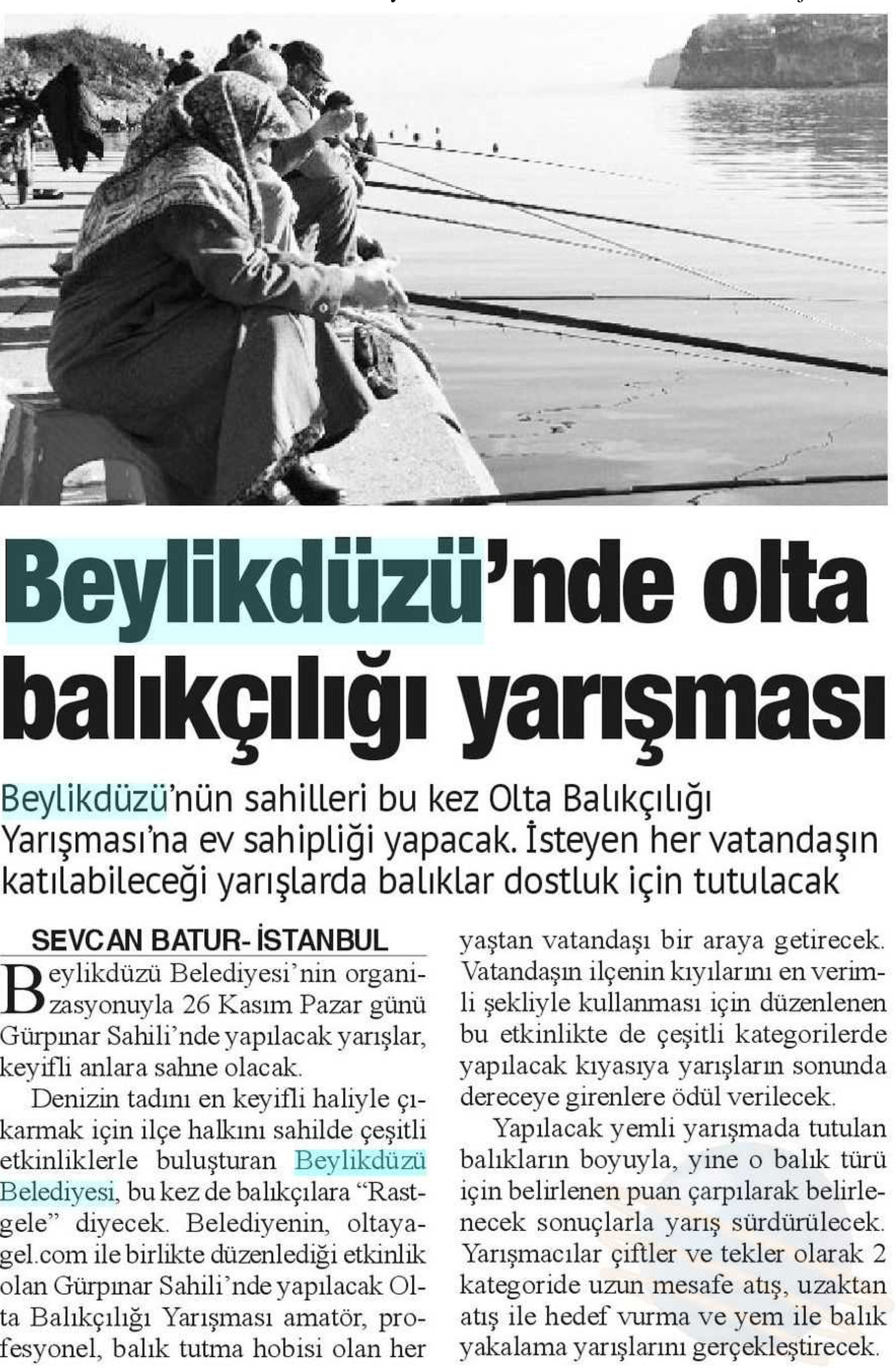 23 Kasım 2017 tarihli "BİZİM ANADOLU" gazetesi. Beylikdüzü'nün sahilleri bu kez Olta Balıkçılığı Yarışması'na ev sahipliği yapacak. İsteyen her vatandaşın katılabileceği yarışlarda balıklar dostluk için tutulacak.