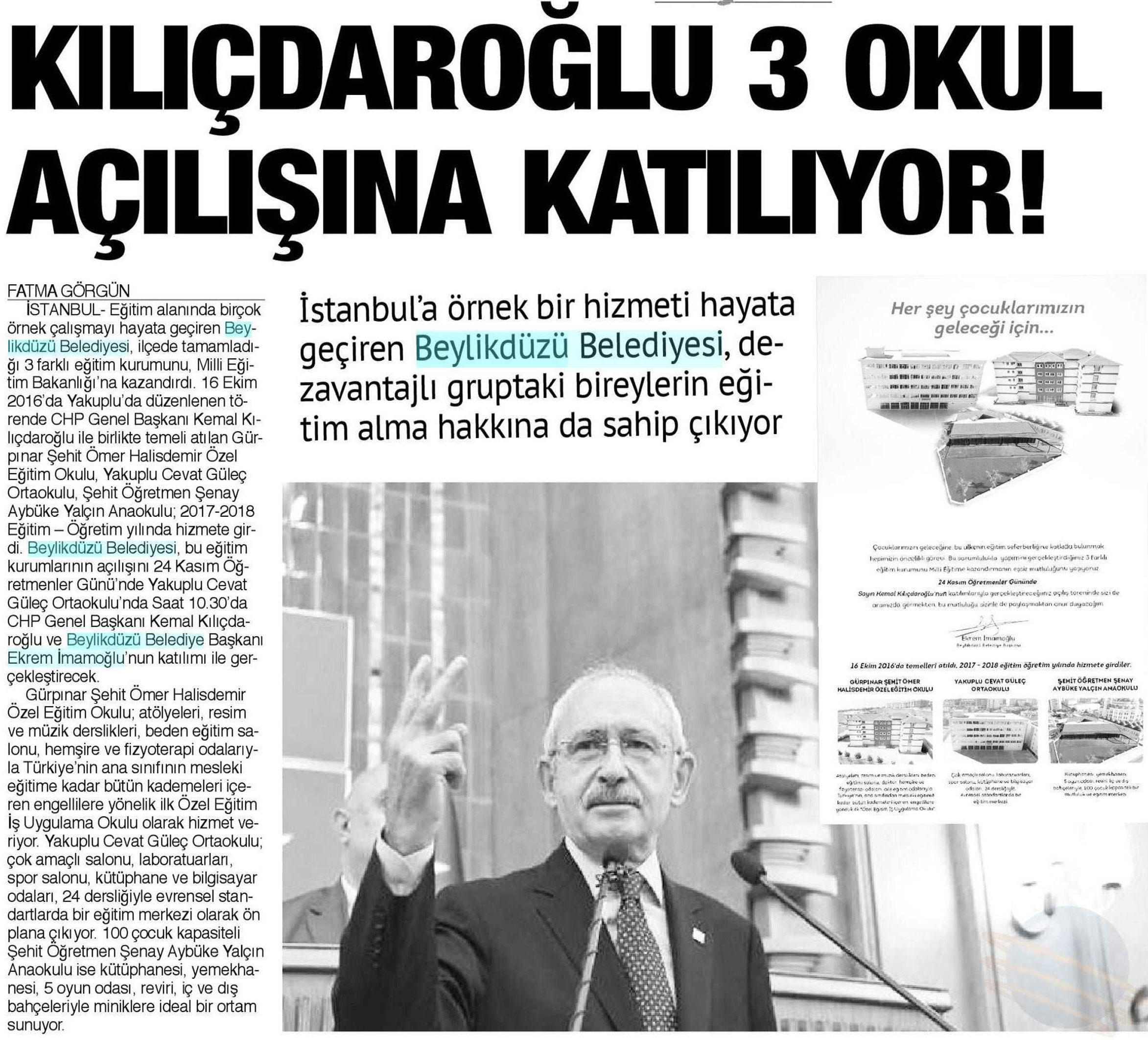 23 Kasım 2017 tarihli "BİZİM ANADOLU" gazetesi. İstanbul'a örnek bir hizmeti hayata geçiren Beylikdüzü Belediyesi, dezavantajlı gruptaki bireylerin eğitim alma hakkına da sahip çıkıyor.