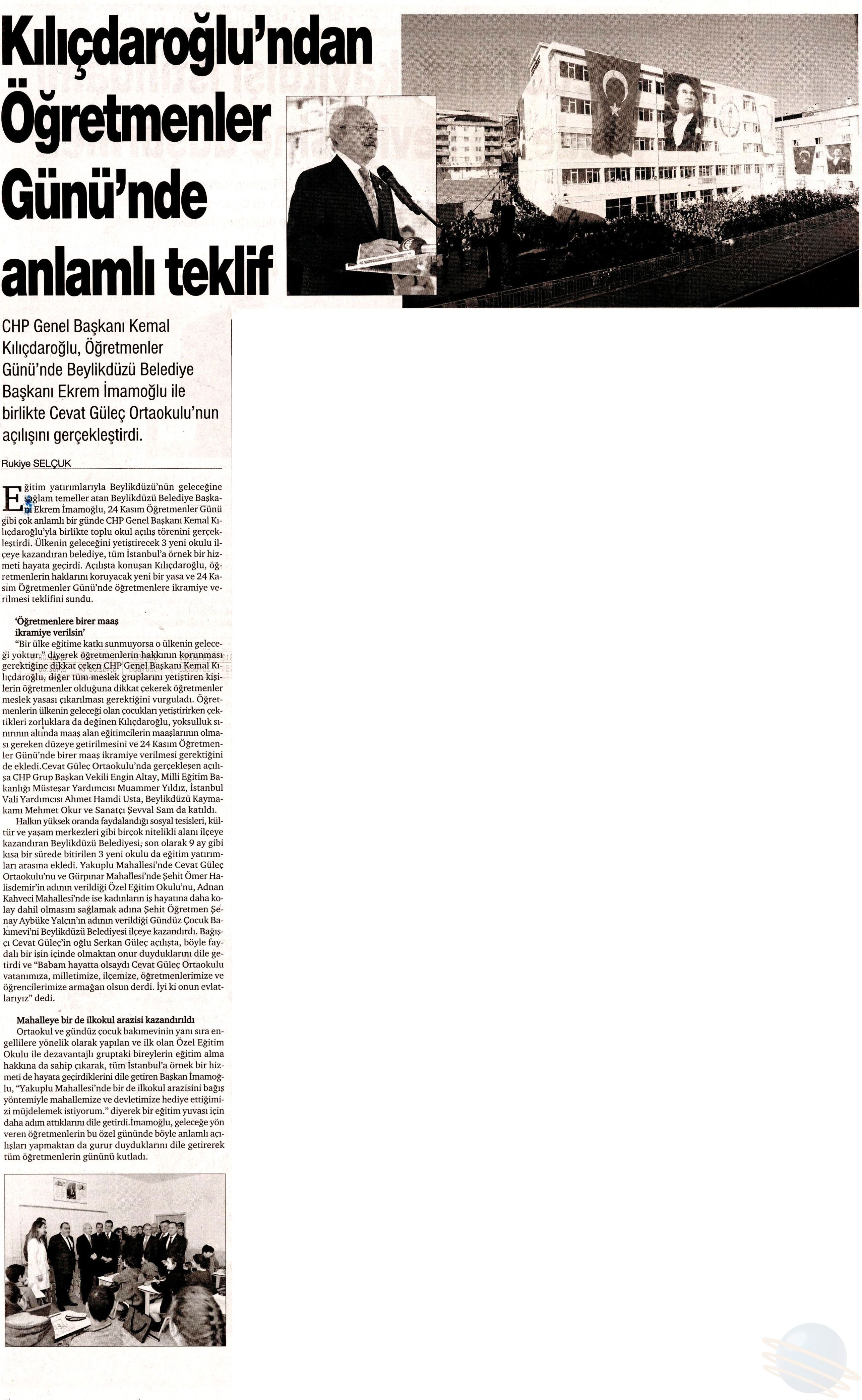 26 Kasım 2017 tarihli "HÜR SES" gazetesi. CHP Genel Başkanı Kemal Kılıçdaroğlu, Öğretmenler Günü'nde Beylikdüzü Belediye Başkanı Ekrem İmamoğlu ile birlikte Cevat Güleç Ortaokulu'nun açılışını gerçekleştirdi.