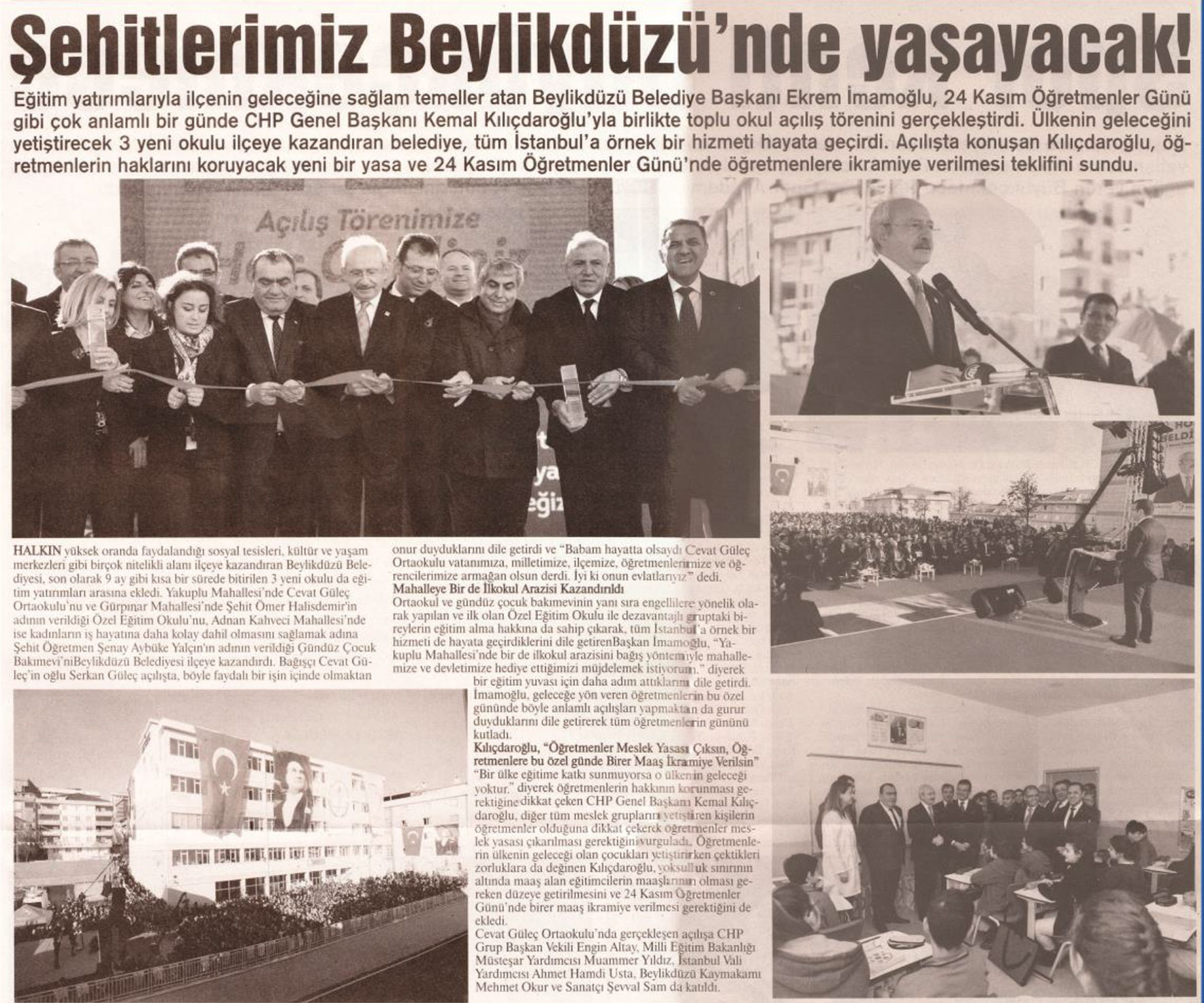 27 Kasım 2017 tarihli "3. BÖLGE" gazetesi. Eğitim yatırımlarıyla ilçenin geleceğine sağlam temeller atan Beylikdüzü Belediye Başkanı Ekrem İmamoğlu, 24 Kasım Öğretmenler Günü gibi çok anlamalı bir günde CHP Genle Başkanı Kemal Kılıçdaroğlu'yla birlikte toplu okul açılış törenini gerçekleştirdi. Üç yeni okulu ilçeye kazandıran belediye, tüm İstanbul'a örnek bir hizmeti hayata geçirdi.