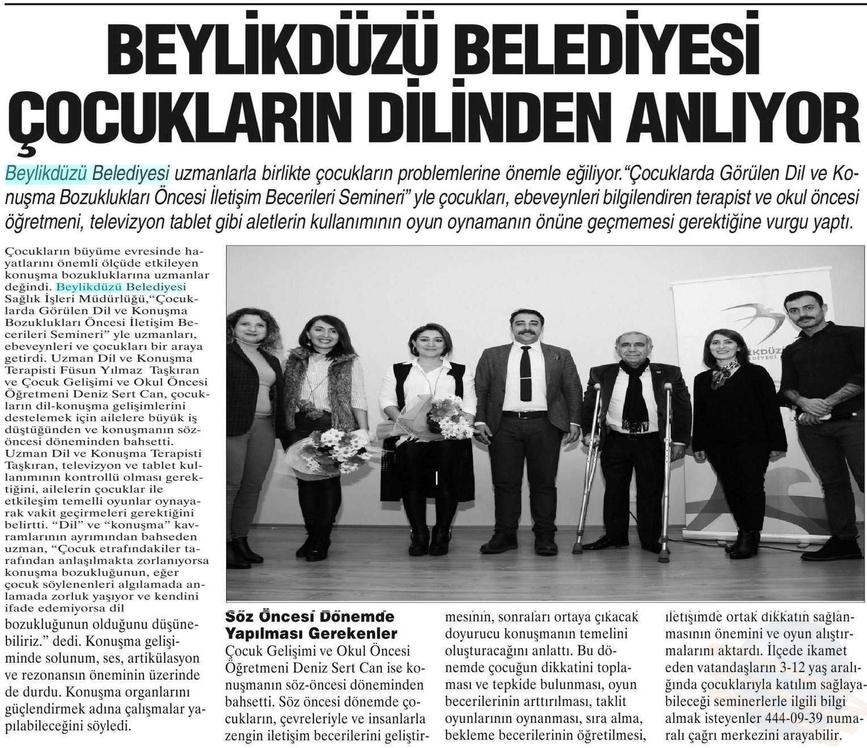 28 Kasım 2017 tarihli BÜYÜKÇEKMECE" gazetesi. Beylikdüzü Belediyesi uzmanlarla birlikte çocukların problemlerine önemle eğiliyor. "Çocuklarda Görülen Dil ve Konuşma Bozuklukları Öncesi İletişim Becerileri Semineri" yle çocukları, ebeveynleri bilgilendiren terapist ve okul öncesi öğretmeni, televizyon tablet gibi aletlerin kullanımının oyun oynamanın önüne geçmemesi gerektiğine vurgu yaptı.