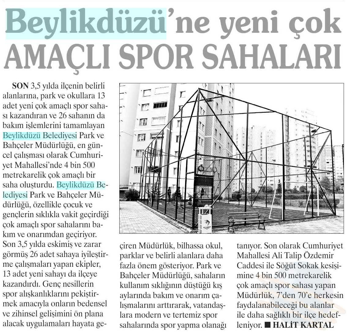 29 Kasım 2017 tarihli " DOKUZ SÜTUN" gazetesi. Beylikdüzü Belediyesi özellikle çocuk ve gençlerin sıklıkla vakit geçirdiği çok amaçlı spor sahalarını bakım ve onarımdan geçiriyor.