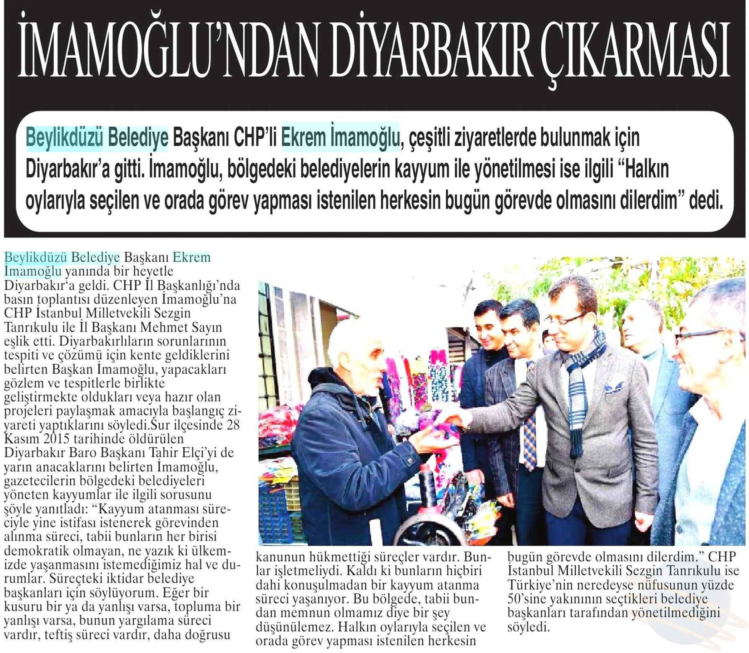 30 Kasım 2017 tarihli "NABIZ" gazetesi. Beylikdüzü Belediye Başkanı Ekrem İmamoğlu, çeşitli ziyaretlerde bulunmak için Diyarbakır'a gitti. İmamoğlu, bölgedeki belediyelerin kayyum ile yönetilmesi ile ilgili "Halkın oylarıyla seçilen ve orada görev yapması istenilen herkesin bugün görevde olmasını dilerim" dedi.