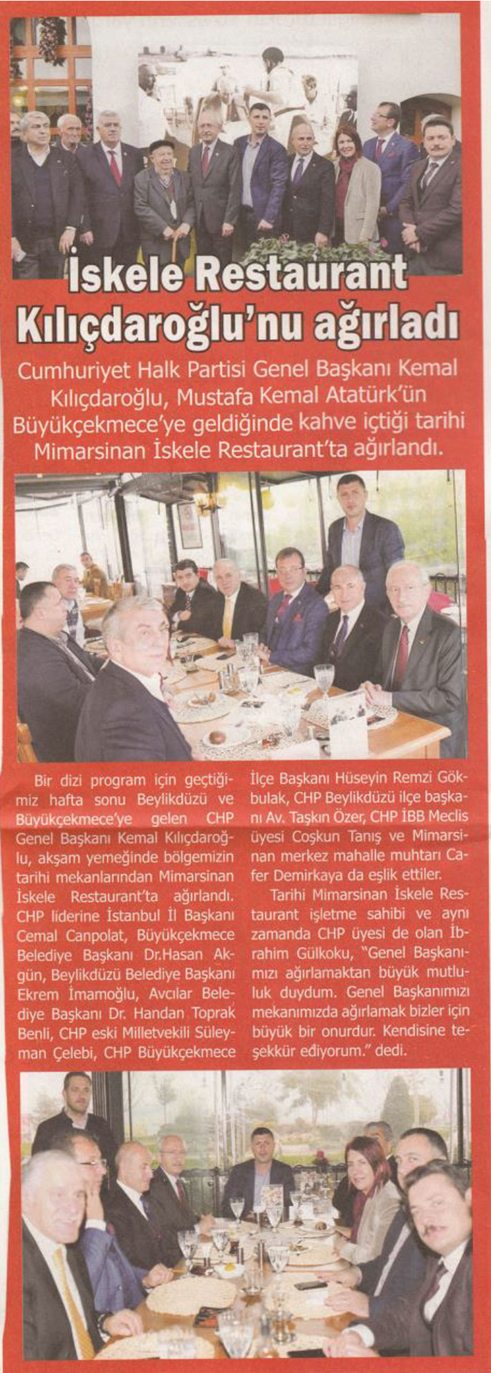 30 Kasım 2017 tarihli "SES" gazetesi. 24 Kasım Öğretmenler Günü'nde Beylikdüzü Belediyesi tarafından gerçekleştirilen toplu okul açılış törenine katılan CHP Genel Başkanı Kemal Kılıçdaroğlu, Mustafa Kemal Atatürk'ün Büyükçekmece'ye geldiğinde kahve içtiği tarihi Mimarsinan İskele Restaurant'ta ağırlandı.