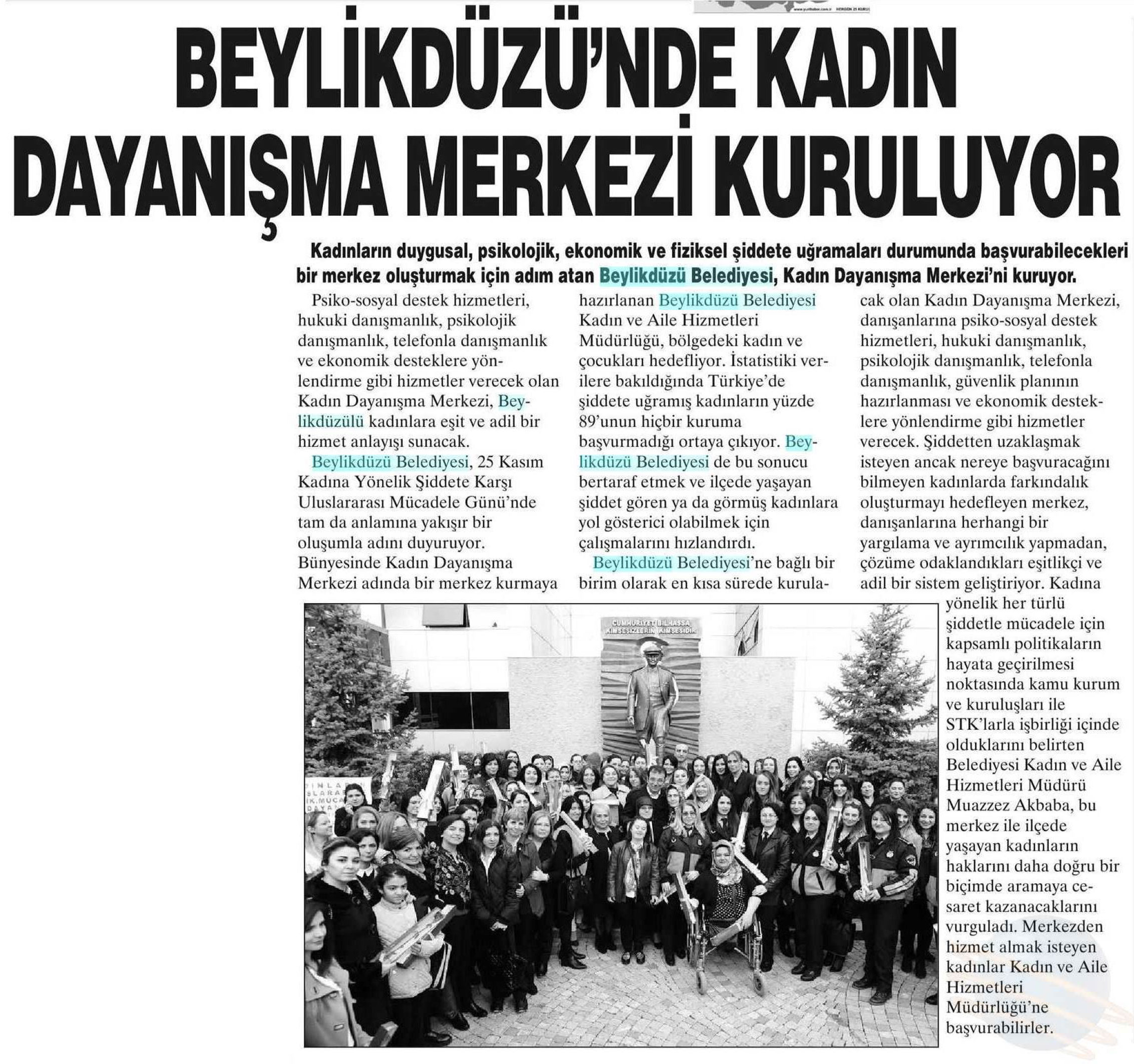 1 Aralık 2017 tarihli "YURT HABER" gazetesi. Kadınların duygusal, psikolojik, ekonomik ve fiziksel şiddete uğramaları durumunda başvurabilecekleri bir merkez oluşturmak için adım atan Beylikdüzü Belediyesi, Kadın Dayanışma Merkezi'ni kuruyor.