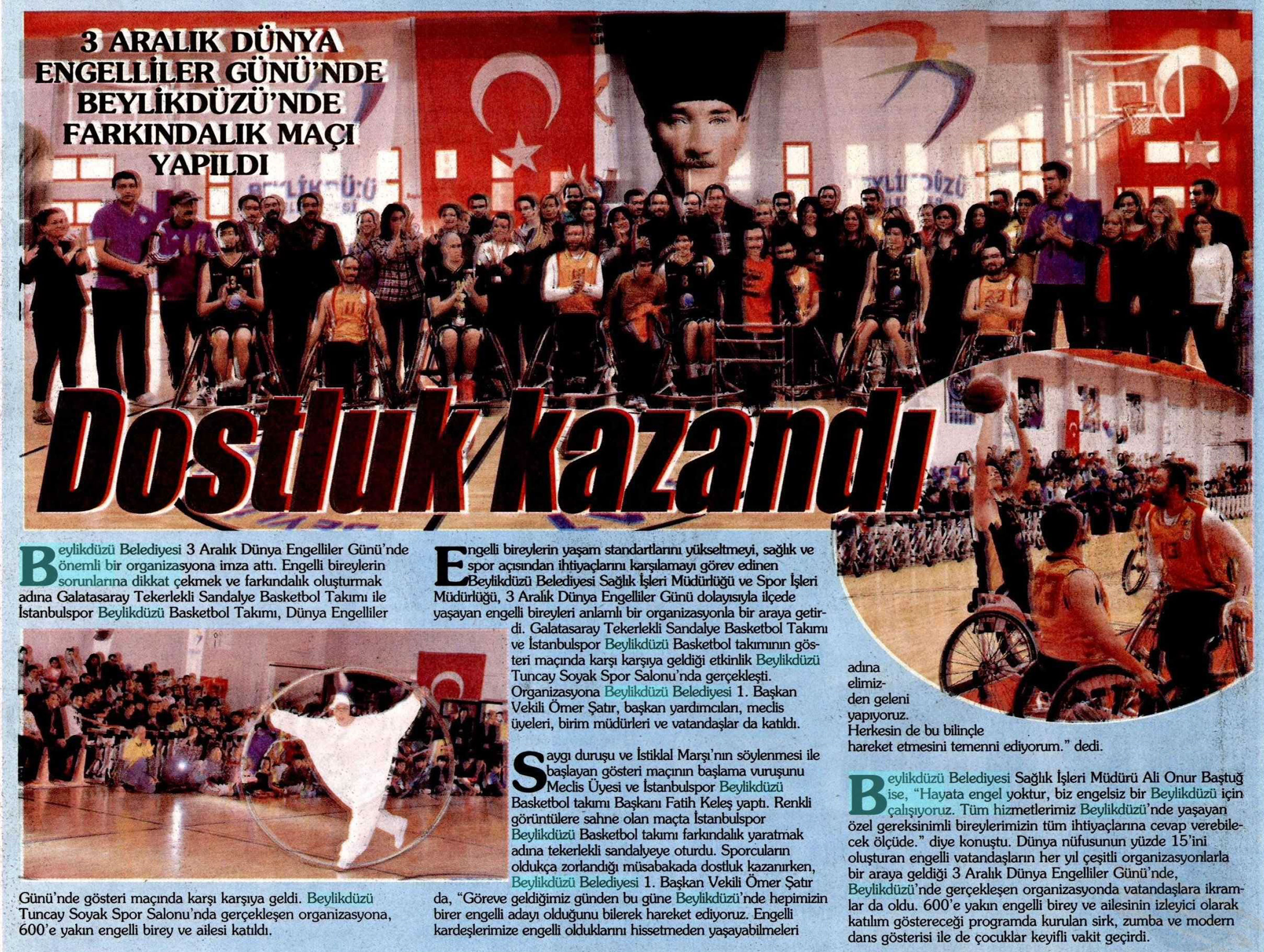 5 Aralık 2017 tarihli "TAKA" gazetesi. Beylikdüzü Belediyesi 3 Aralık Dünya Engelliler Günü'nde engelli bireylerin sorunlarına dikkat çekmek ve farkındalık oluşturmak adına Galatasaray Tekerlekli Sandalye Basketbol Takımı ile İstanbulspor Beylikdüzü Basketbol Takımı, Dünya Engelliler Günü'nde gösteri maçında karşı karşıya geldi.