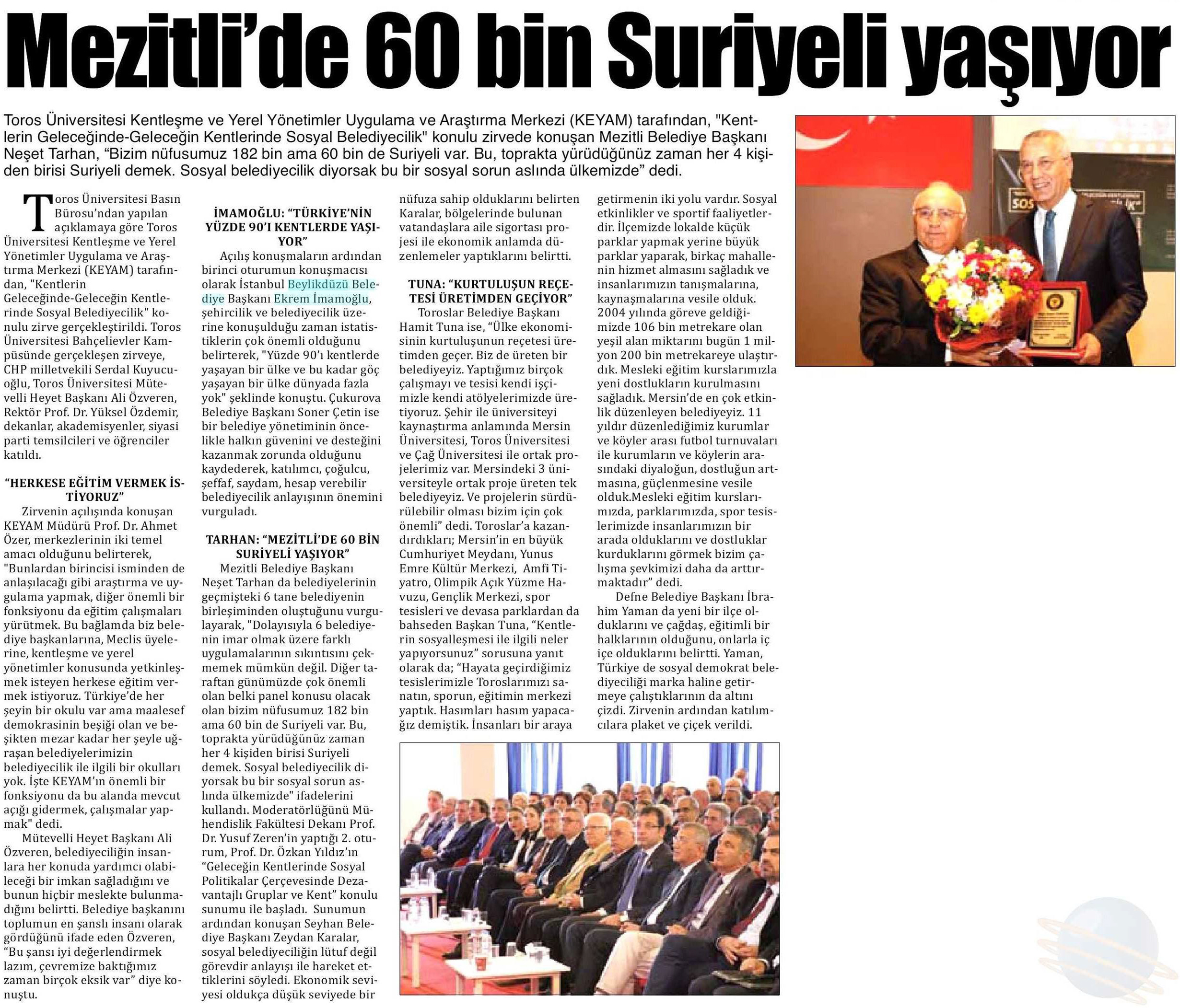 4 Aralık 2017 tarihli "AKDENİZ" gazetesi. Toros Üniversitesi Kentleşme ve Yerel Yönetimler Uygulama ve Araştırma Merkezi tarafından, "Kentlerin Geleceğinde -Geleceğin Kentlerinde Sosyal Belediyecilik" konulu zirvede açılış konuşmalarının ardından birinci oturumun konuşmacısı olarak Beylikdüzü Belediye Başkanı Ekrem İmamoğlu, şehircilik ve belediye üzerine konuşulduğu zaman istatistiklerin çok önemli olduğunu belirterek, "Yüzde 90'ı kentlerde yaşayan bir ülke ve bu kadar göç yaşayan bir ülke dünyada fazla yok şeklinde konuştu.