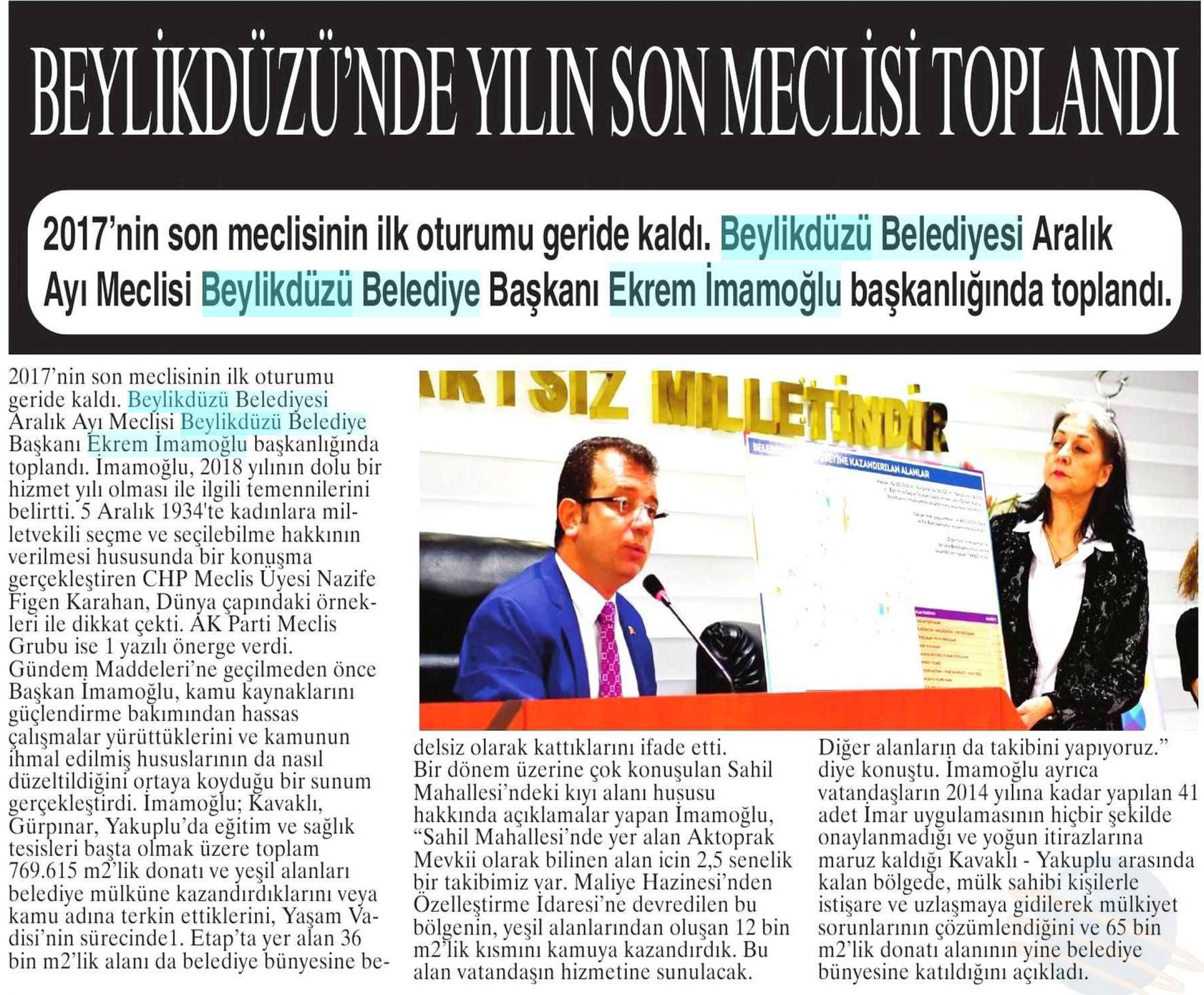 6 Aralık 2017 tarihli "NABIZ" gazetesi. 2017'nin son meclisinin ilk oturumu geride kaldı. Beylikdüzü Belediyesi Aralık Ayı Meclisi Beylikdüzü Belediye Başkanı Ekrem İmamoğlu başkanlığında toplandı.