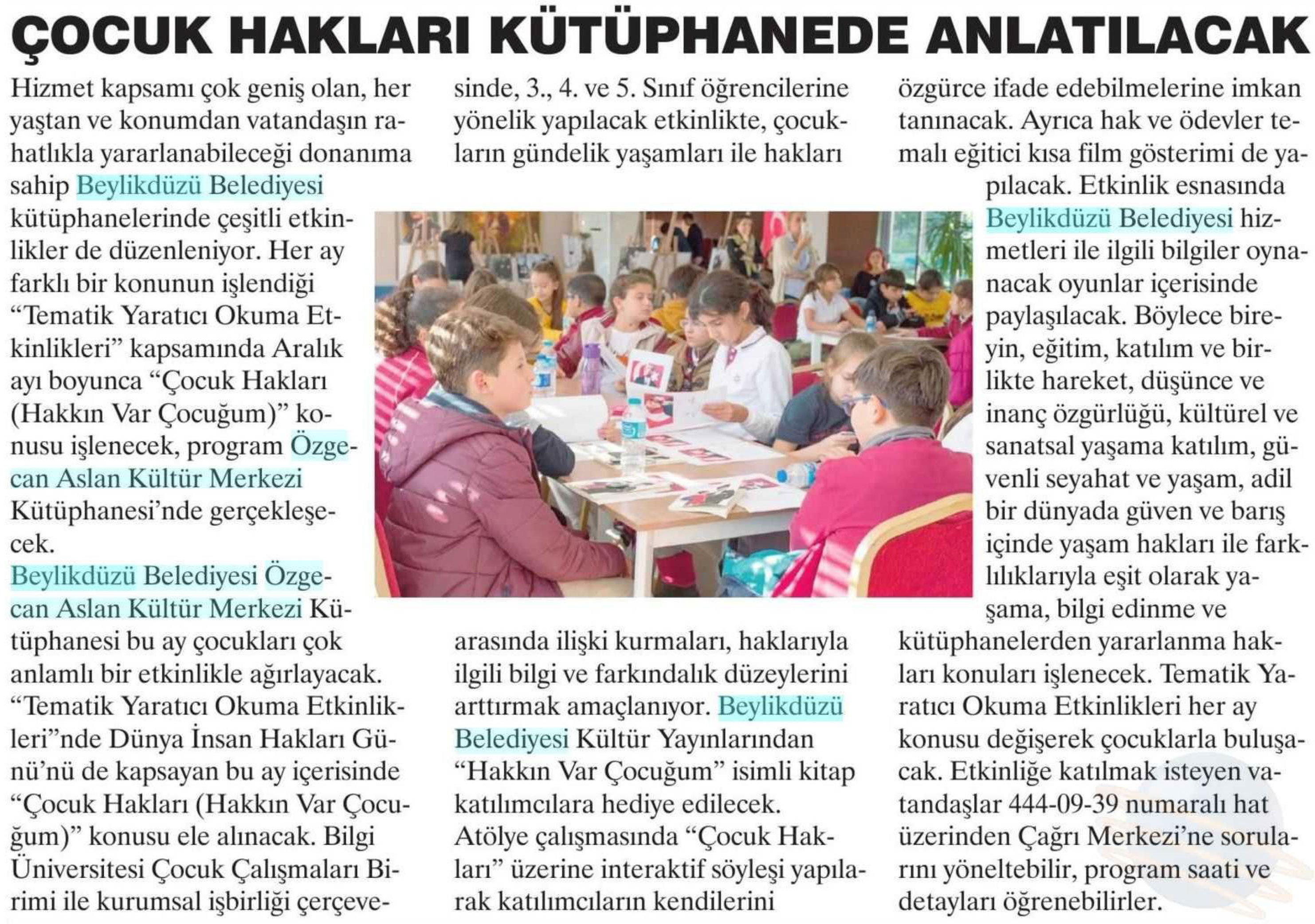 7 Aralık 2017 tarihli " ZEYNA" gazetesi. Beylikdüzü Belediyesi kütüphanelerinde çeşitli etkinlikler de düzenleniyor. Her ay farklı bir bir konunun işlendiği "Tematik Yaratıcı Okuma Etkinlikleri" kapsamında Aralık ayı boyunca "Çocuk Hakları (Hakkın Var Çocuğum)" konusu işlenecek, program Özgecan Aslan Kültür Merkezi Kütüphanesi'nde gerçekleşecek.