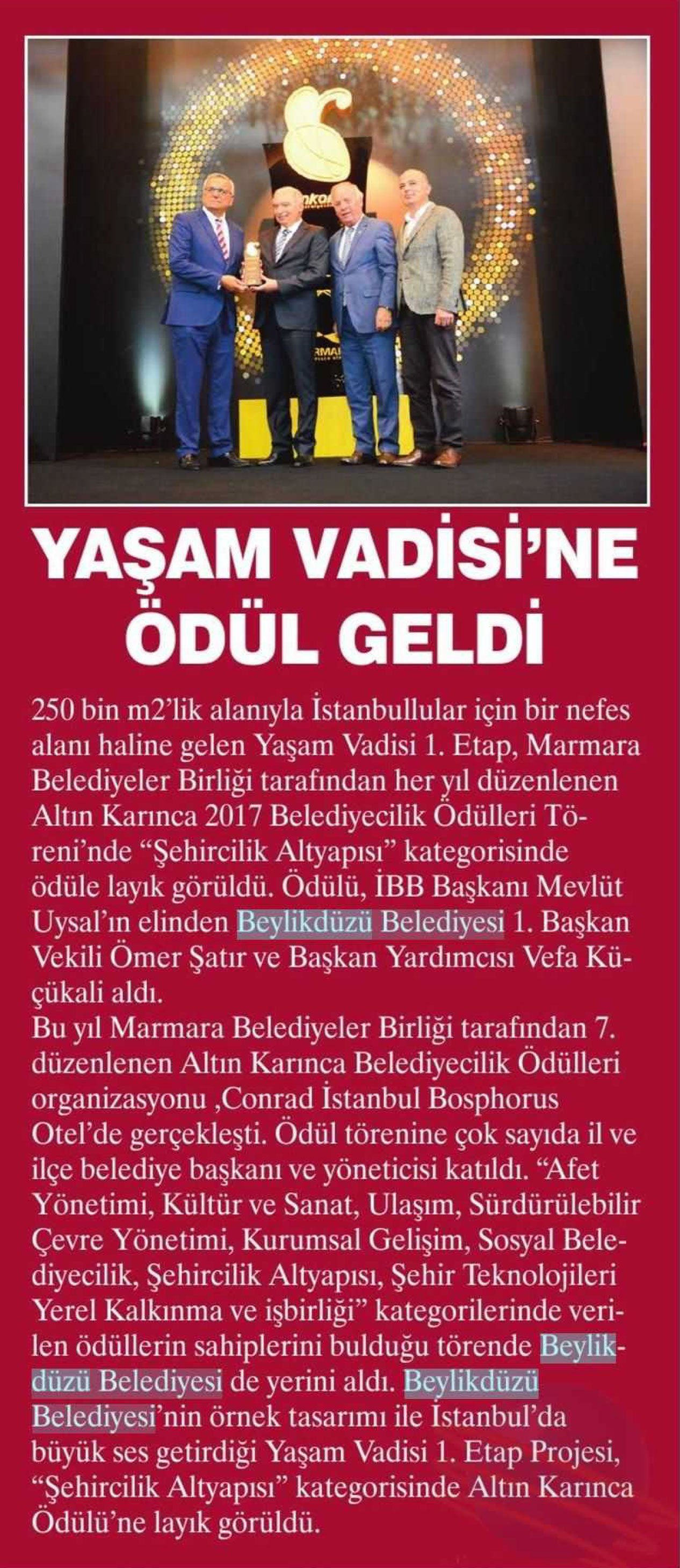 7 Aralık 2017 tarihli "ZEYNA" gazetesi. Beylikdüzü Belediyesi'nin örnek tasarımı ile İstanbul'da büyük ses getirdiği Yaşam Vadisi 1. Etap Projesi, "Şehircilik Altyapısı" kategorisinde Altın Karınca Ödülü'ne layık görüldü.