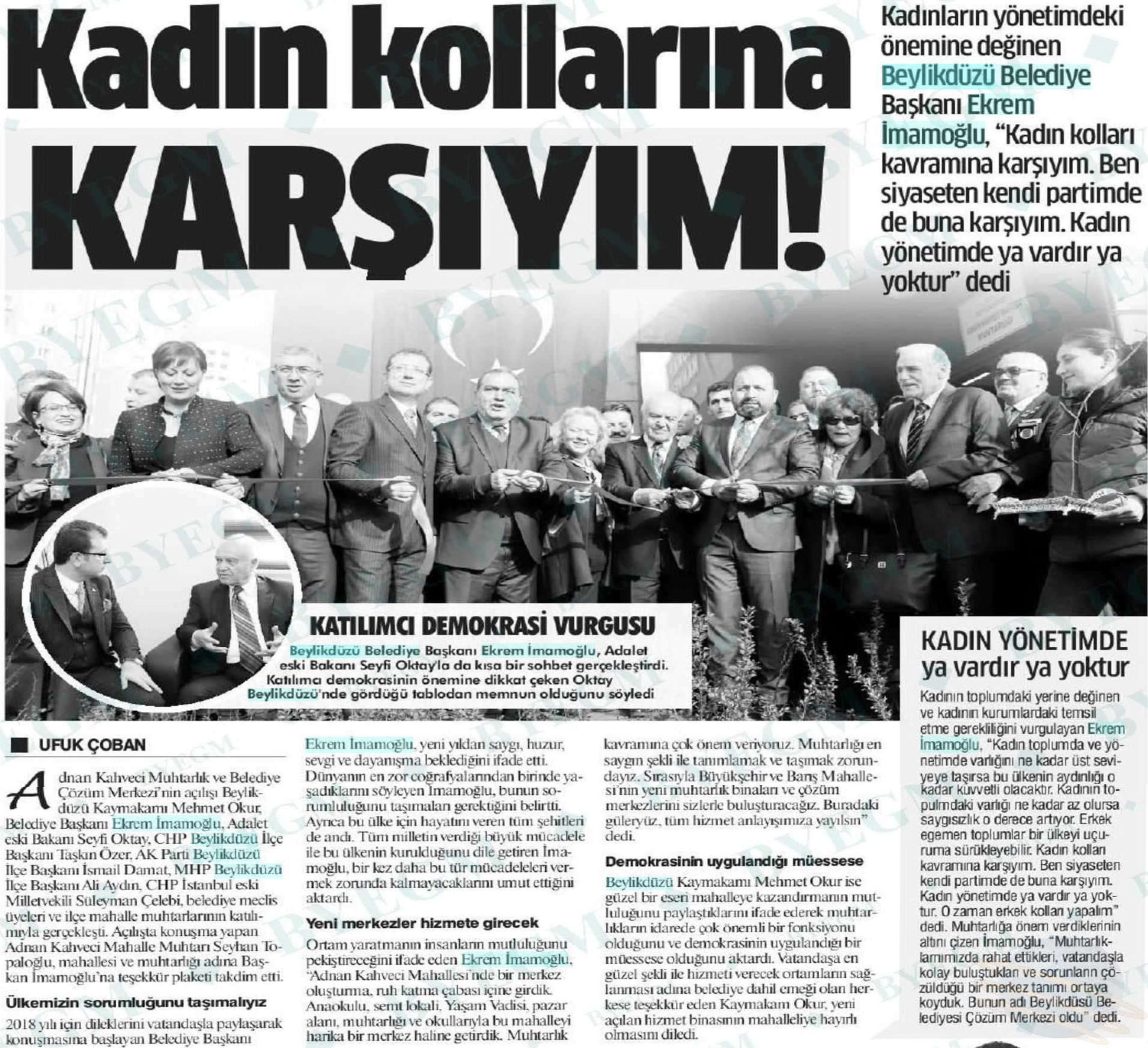 13 Aralık 2017 tarihli "DAMGA" gazetesi. Kadınların yönetimdeki önemine değinen Beylikdüzü Belediye Başkanı Ekrem İmamoğlu, "Kadın kolları kavramına karşıyım. Ben siyaseten kendi partimde de buna karşıyım.Kadın yönetimde ya vardır ya yoktur" dedi.