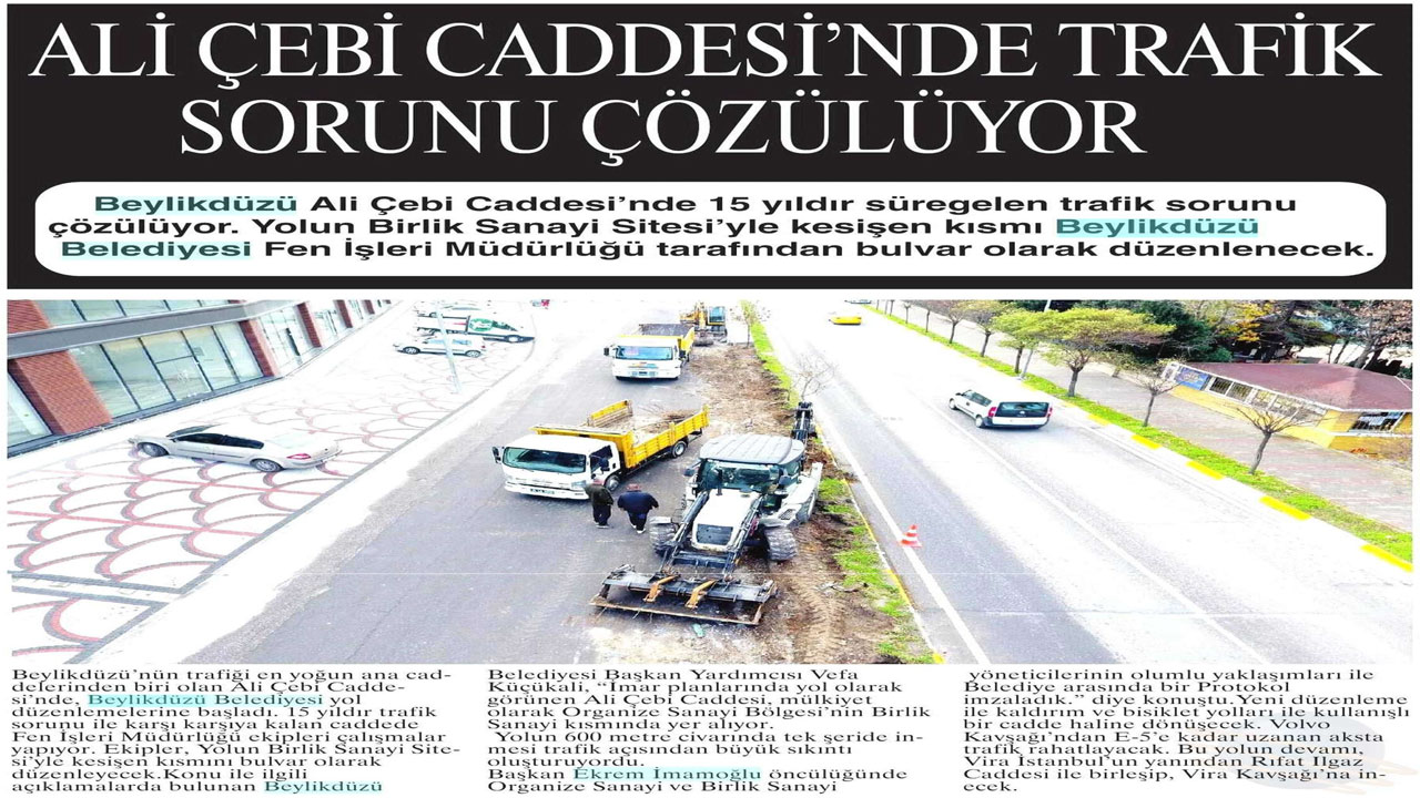 14 Aralık 2017 tarihli "NABIZ" gazetesi. Beylikdüzü Ali Çebi Caddesi'nde 15 yıldır süregelen trafik sorunu çözülüyor.Yolun Birlik Sanayi Sitesi'yle kesişen kısmı Beylikdüzü Belediyesi Fen İşleri Müdürlüğü tarafından bulvar olarak düzenlenecek.