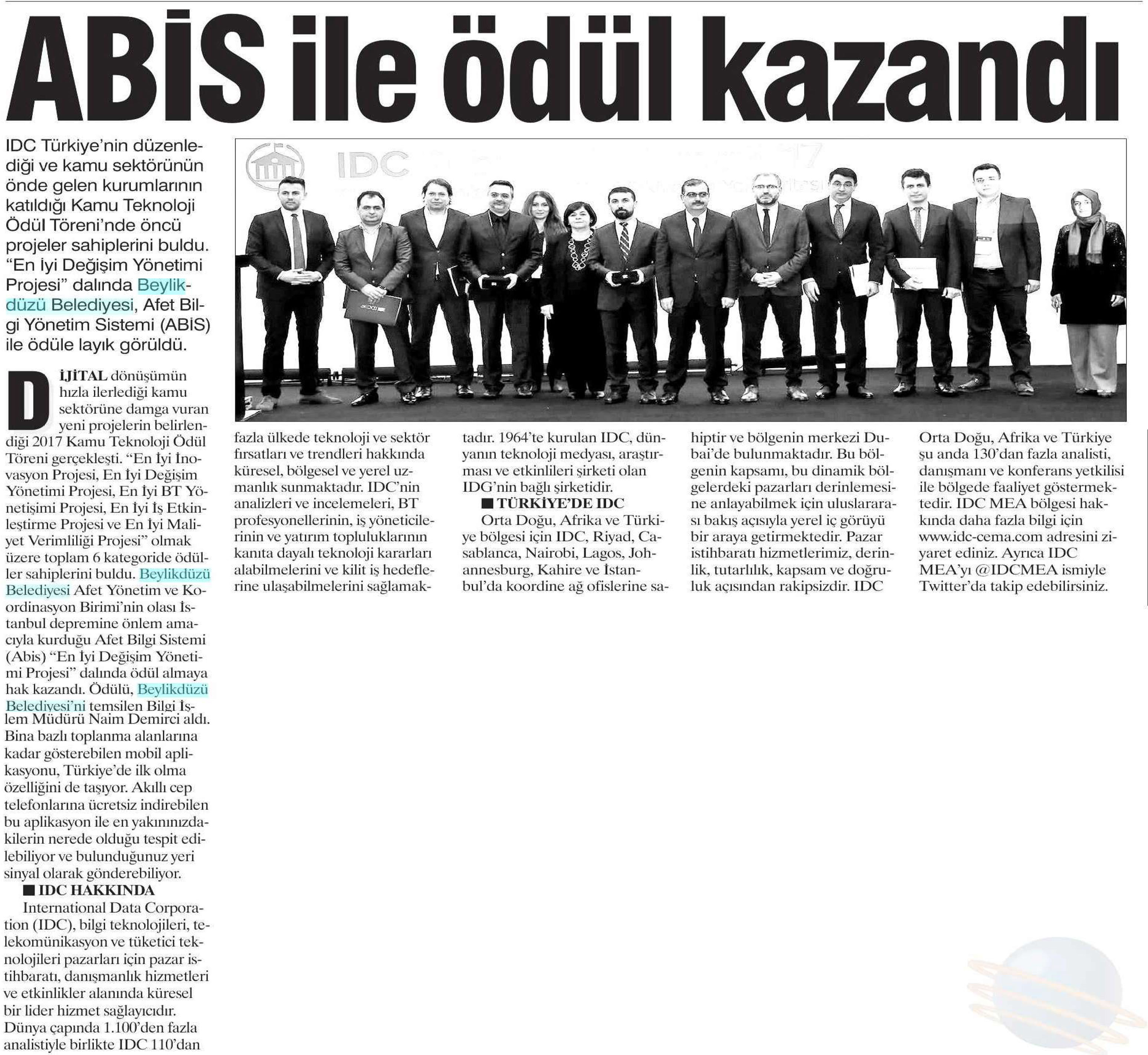 18 Aralık 2017 tarihli " DOKUZ SÜTUN" gazetesi. IDC Türkiye'nin düzenlediği ve kamu sektörünün önde gelen kurumlarının katıldığı Kamu Teknoloji Ödül Töreni'nde öncü projeler sahiplerini buldu. " En İyi Değişim Yönetimi Projesi" dalında Beylikdüzü Belediyesi, Afet Bilgi Yönetim Sistemi (ABİS) ile ödüle layık görüldü.