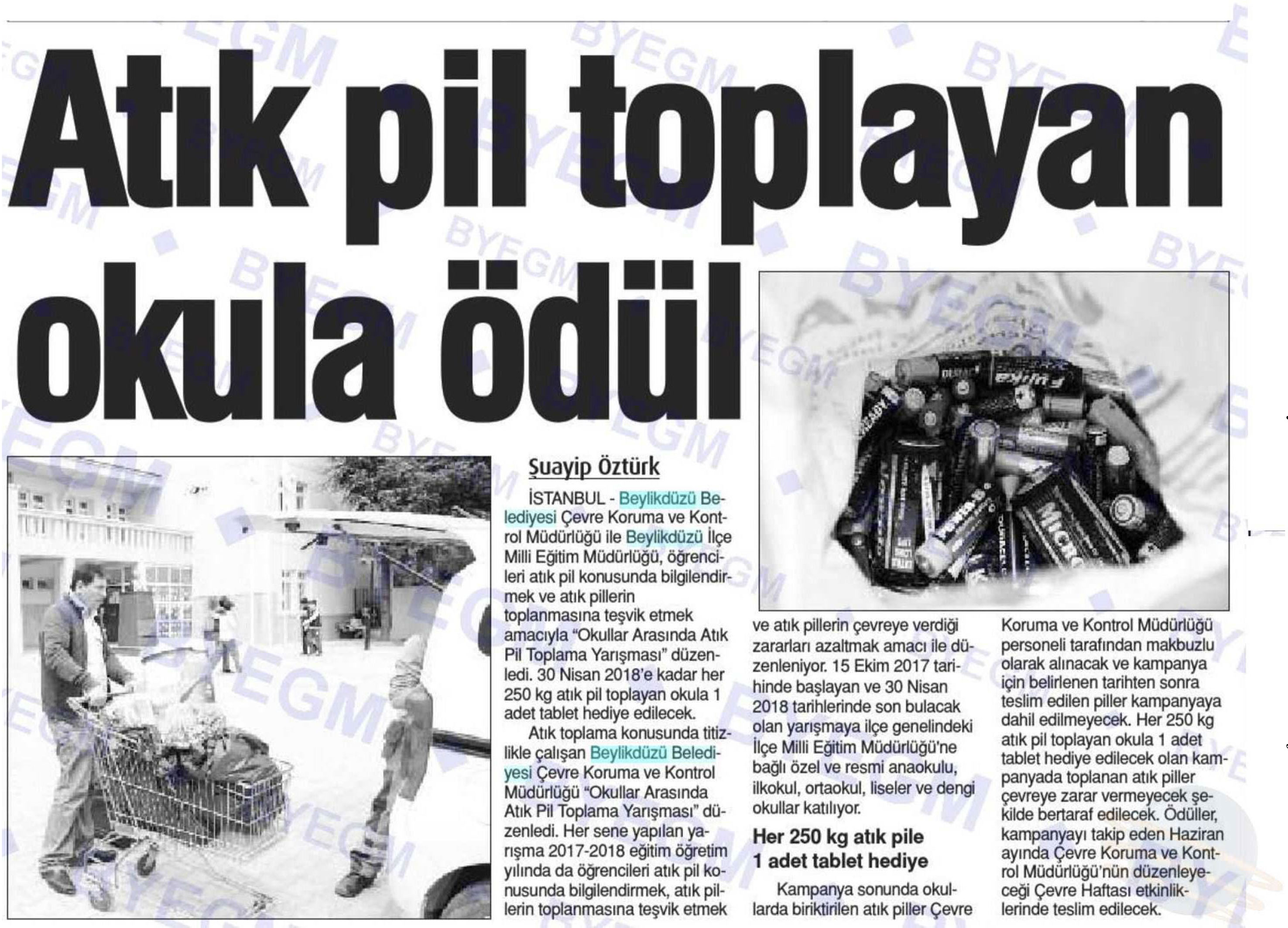 18 Aralık 2017 tarihli " YENİ ÇAĞRI" gazetesi. Beylikdüzü Belediyesi Çevre Koruma ve Kontrol Müdürlüğü ile Beylikdüzü İlçe Eğitim Müdürlüğü, öğrencileri atık pil konusunda bilgilendirmek ve atık pillerin toplanmasına teşvik etmek amacıyla "Okullar Arasında Atık Pil Toplama Yarışması" düzenledi.